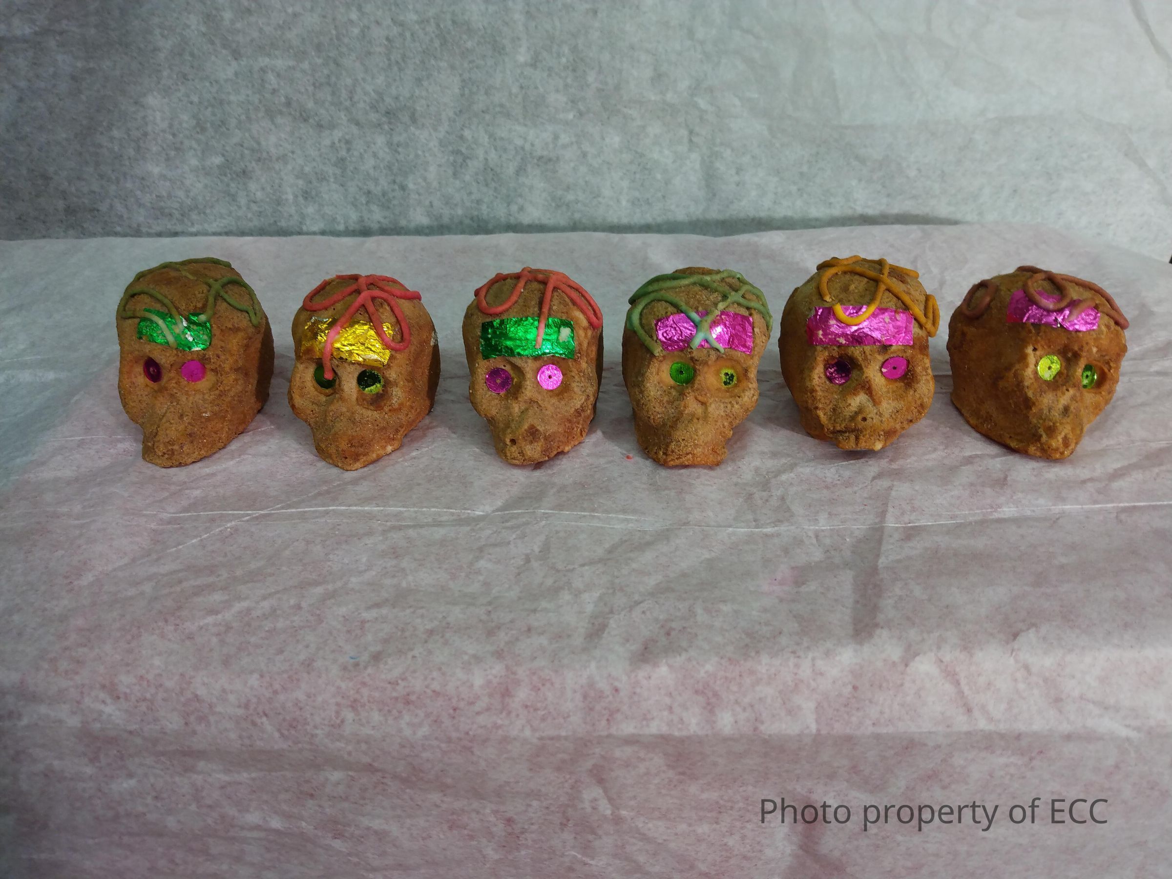 Six miniature sugar skulls.