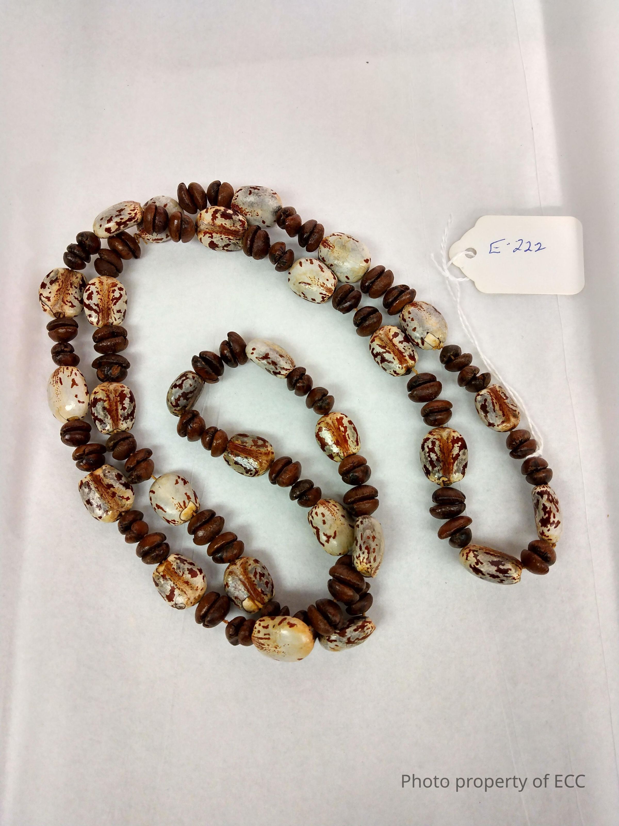 A necklace made from lacquered coffee beans and large white beans with brown speckles. The beans alternate (two coffee beans and then one speckled bean).Item Type