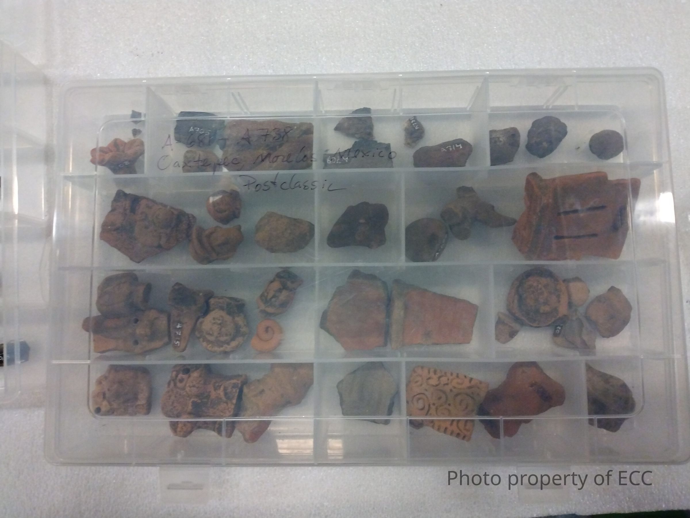 Sherds and archaeological ceramic pieces from Oaxtepec, Morelos, Mexico. They have classified as "postclassic"Collection