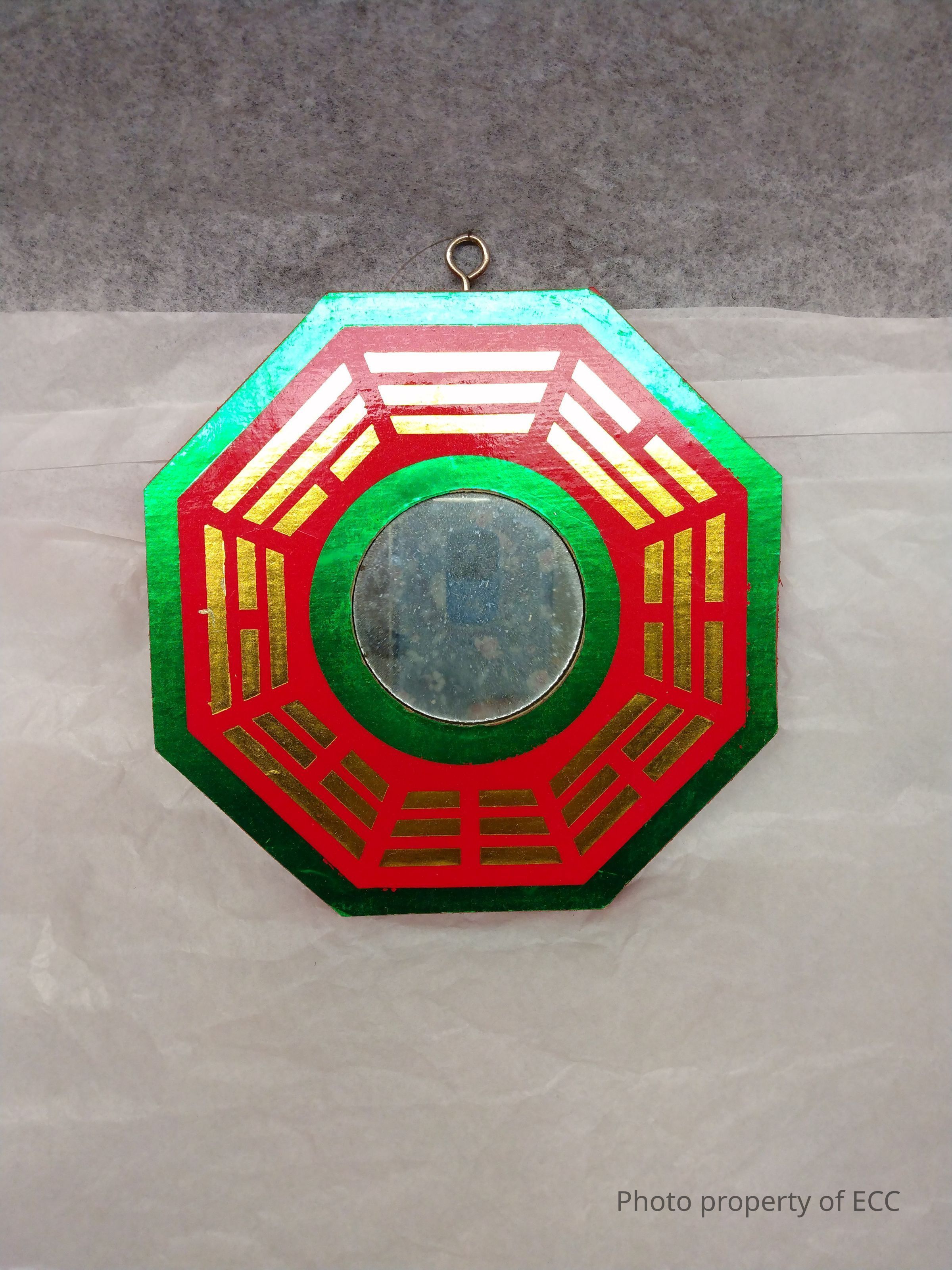 A wooden octagon painted red with shiny green around the edges. There are three golden lines on each of the eight sides of the octagon. The center of the octagon has a circular mirror surrounded by a circle of shiny green. There is a hook at the top of the octagon with a wire through it.Collection