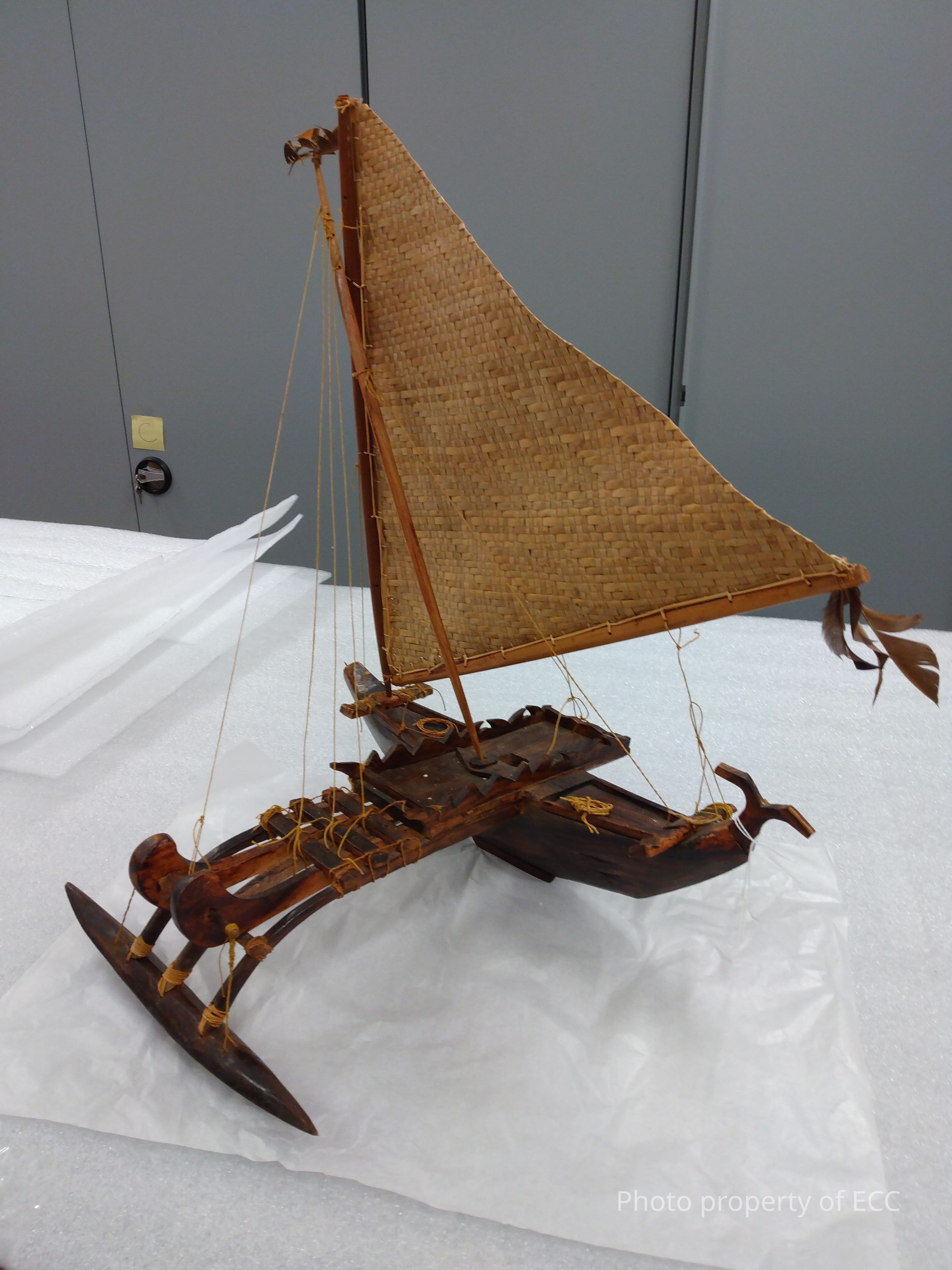 A model of a 'walap' outrigger canoe made with dark brown hardwood. The sail is made out of woven pandanas (a tropical plant with long, blade like leaves). It has feather details at the top of the center mast and at the end of the boom. Lines are made of natural fibers. The boat bears labels with the numbers "L35.178A" on the underside and "L35.1.78C" on the stern ornament, while the main sail is warped and the tie securing it to the main hull is slightly to long, causing it to swing when handled. The "ama" (the float attached to the main hull) is also slightly loose on the "iako" (the three poles that attach the ama to the main hull) The main bow ornament is missing, causing a nail to protrude on one end, and a few of the ties securing the sail to the mast have either snapped or come loose.Context