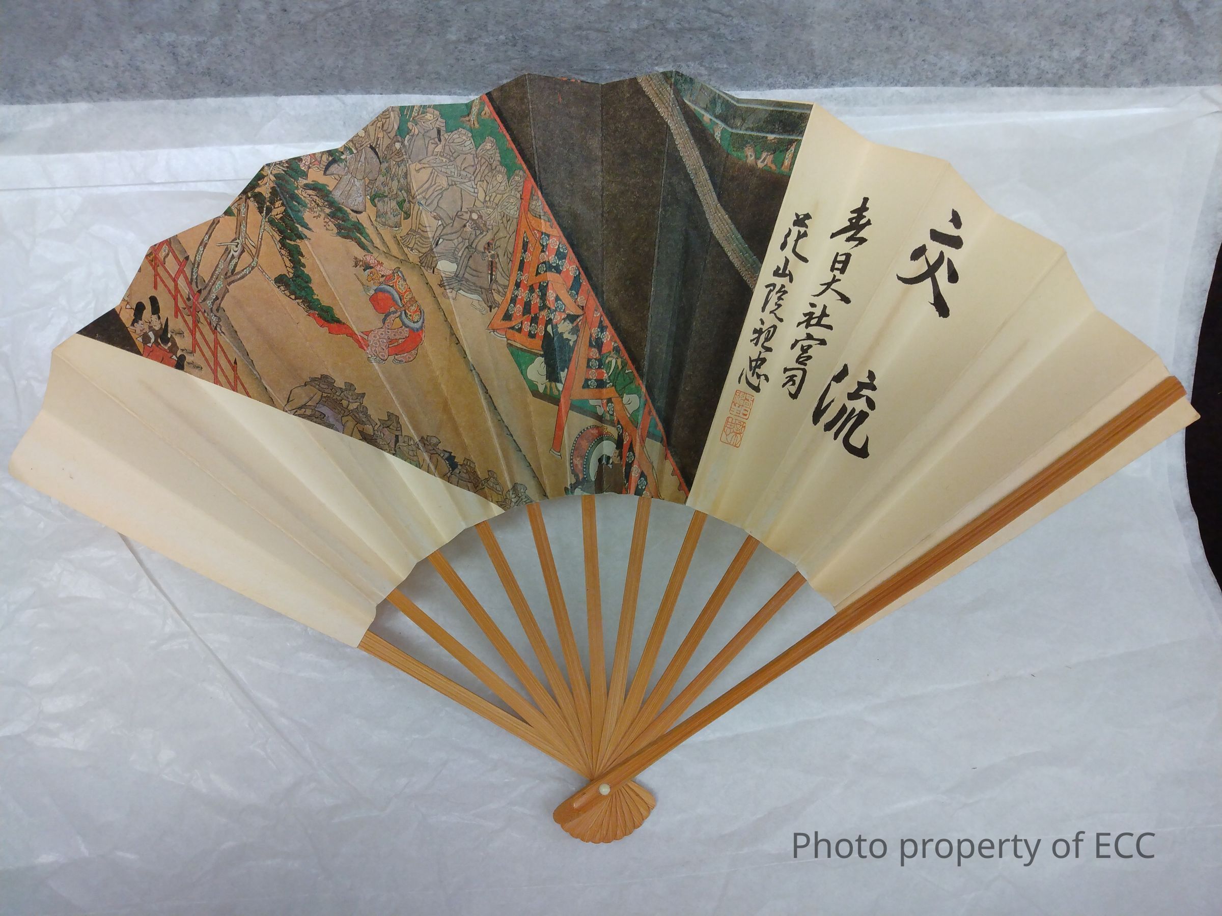 A fan with black writing on the right side and a picture in the middle and left. The picture shows a figure in a red robe in a courtyard surrounded by people wearing ray outfits. There is a building on the right of the picture with two people drinking and a person playing a drum outside it. The paper of the fan is wider than the ribs of the fan are.Collection