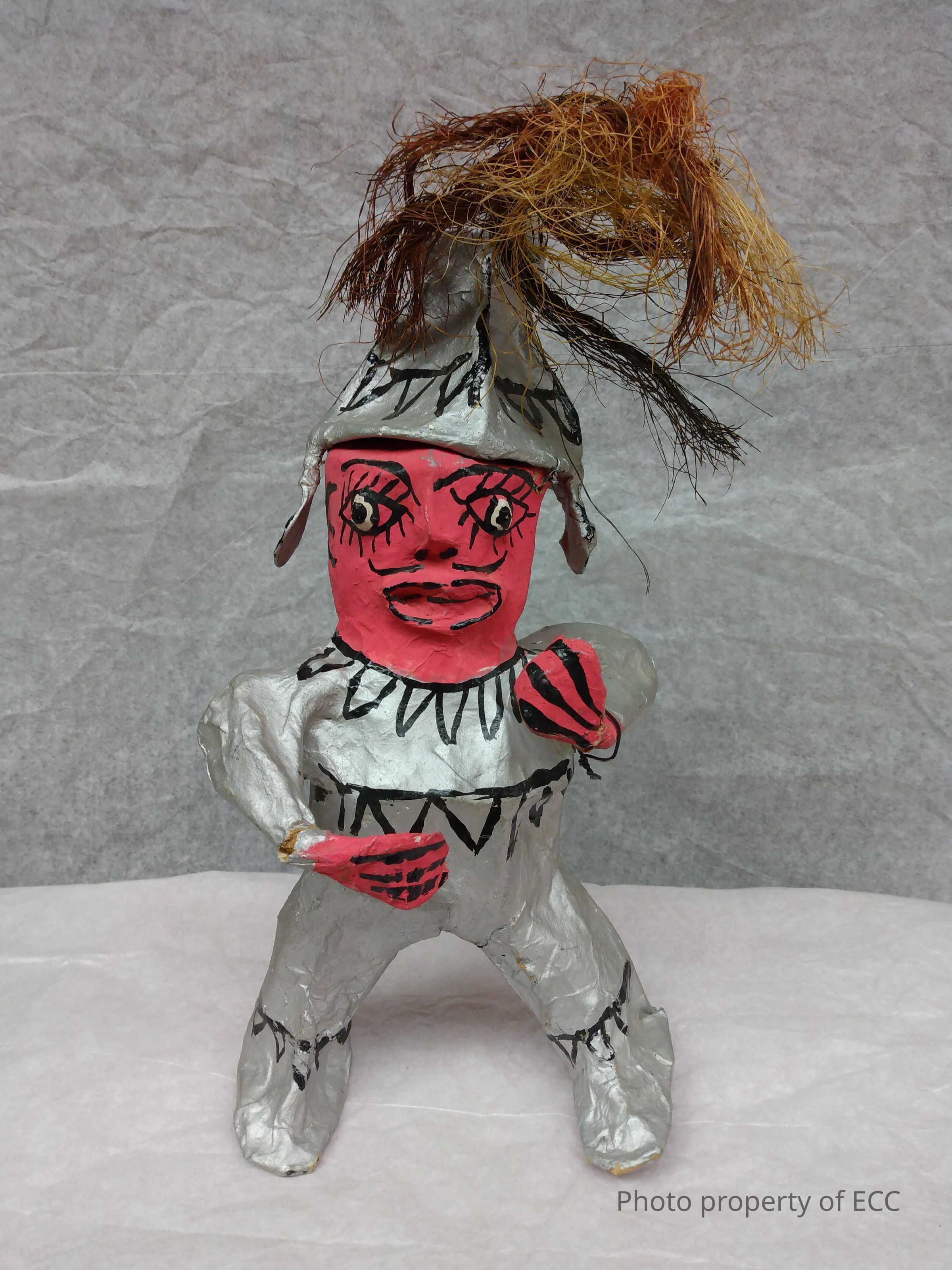 Paper mache man, possibly a conquistador. Red face and red hands with silver suit and hat. Hat has twine on top.Collection