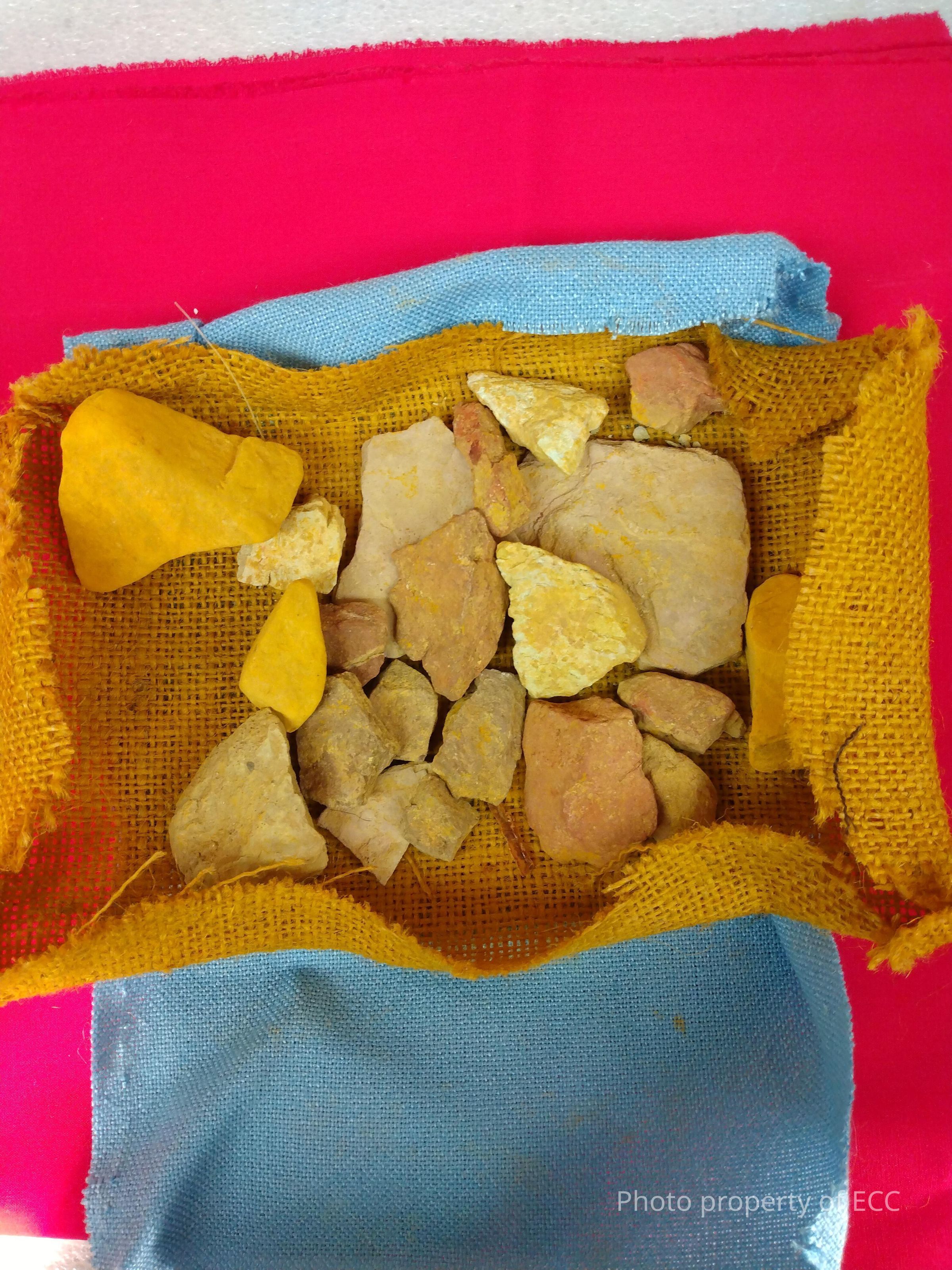 A collection of rocks in a cardboard box in various sizes and colors. The colors include yellow, light pink, reddish brown, and white.Collection