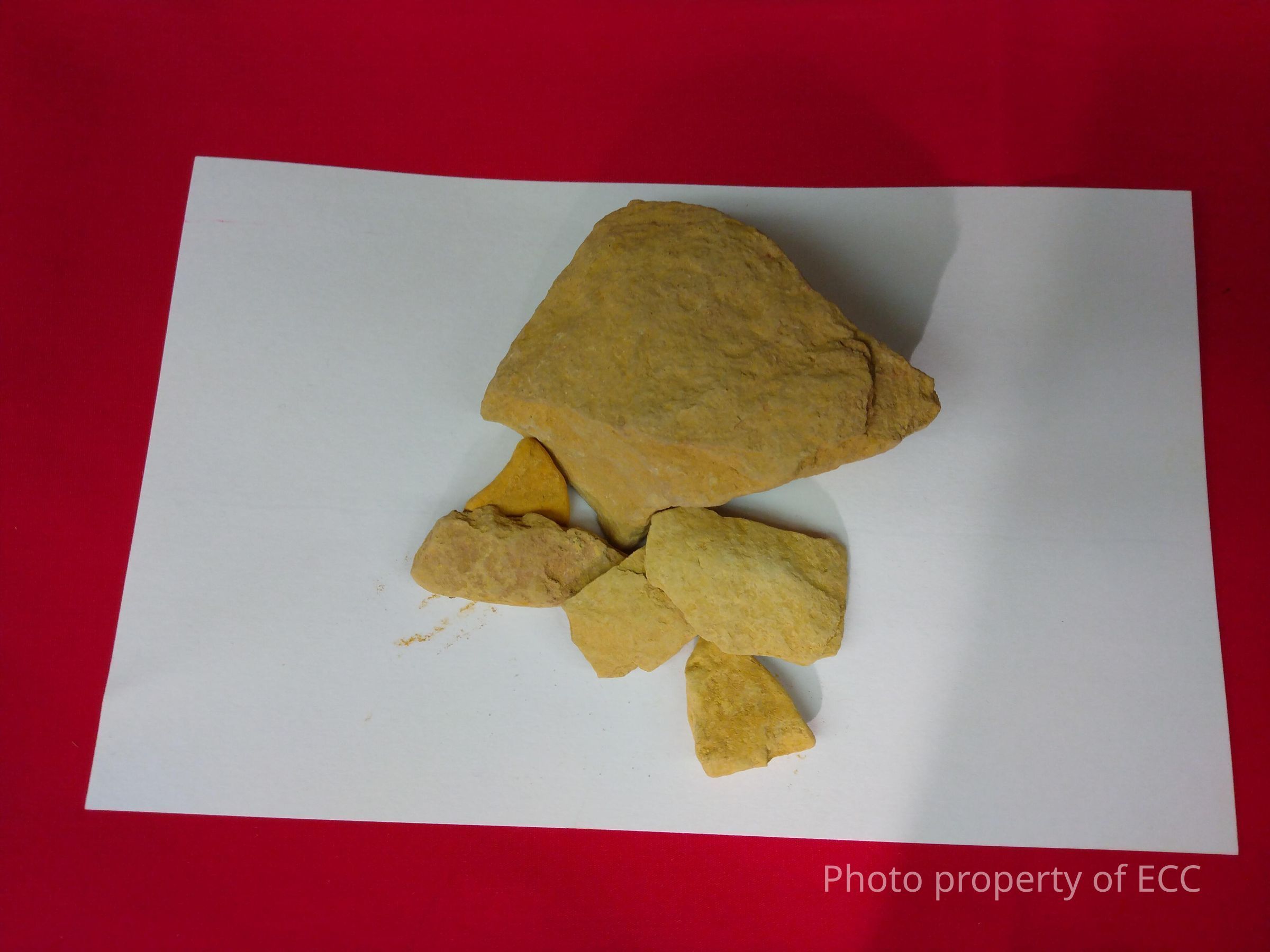 A cardboard box with bags of limonite pigment stones. The stones are a hard, chalky texture. They will leave a yellow, dusty residue on hands and other surfaces. There is also a 1/2" paint brush made in Germany, sinew on fiber twisted into a circle, and a cord of human hair.Collection