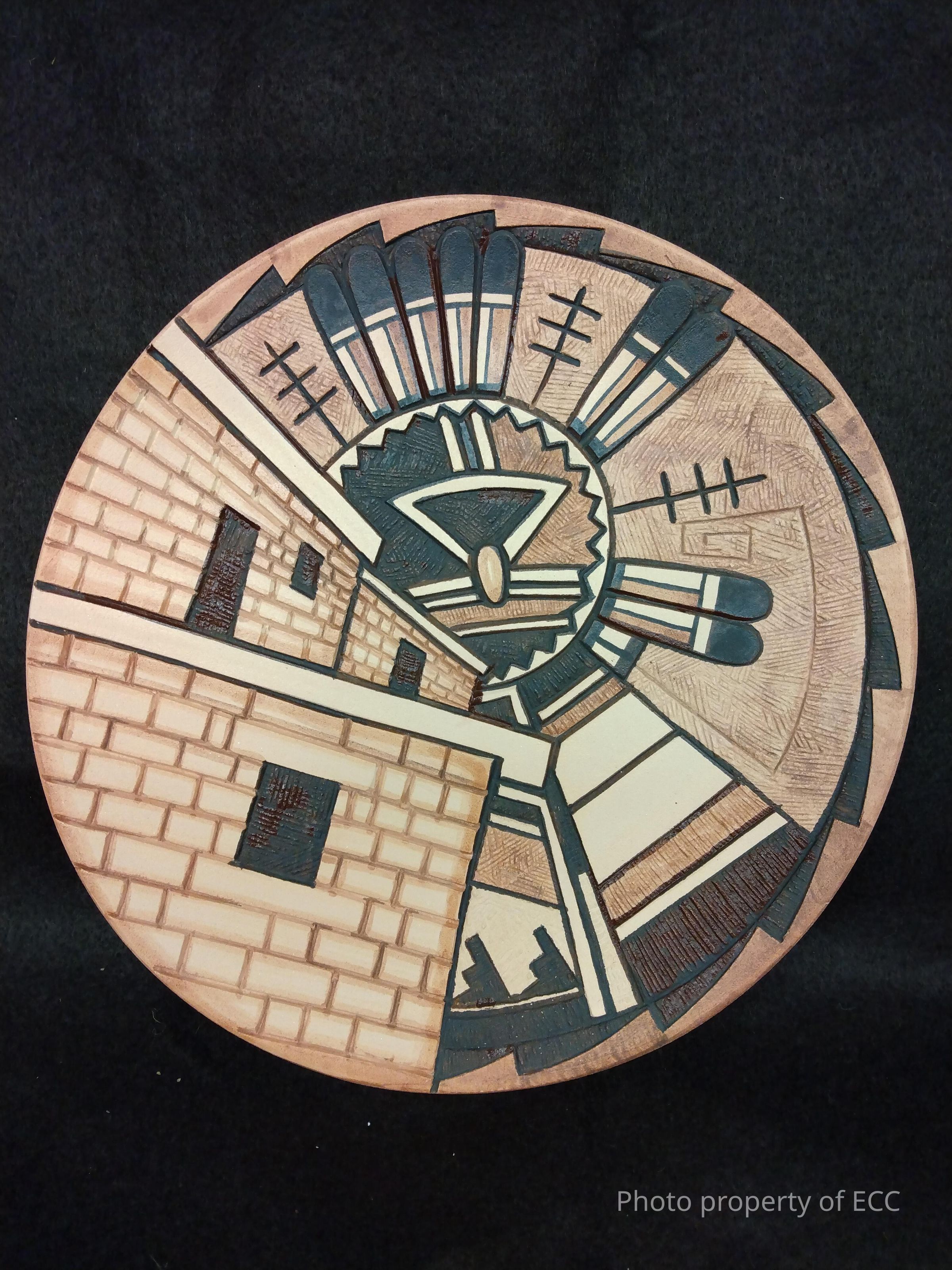 Polychrome plate with painted carved pueblo village and kachina design. The plate was handmade via the coil and scrape method using native clay and pigments. It was made in 2003 by Garry Polaco.Collection