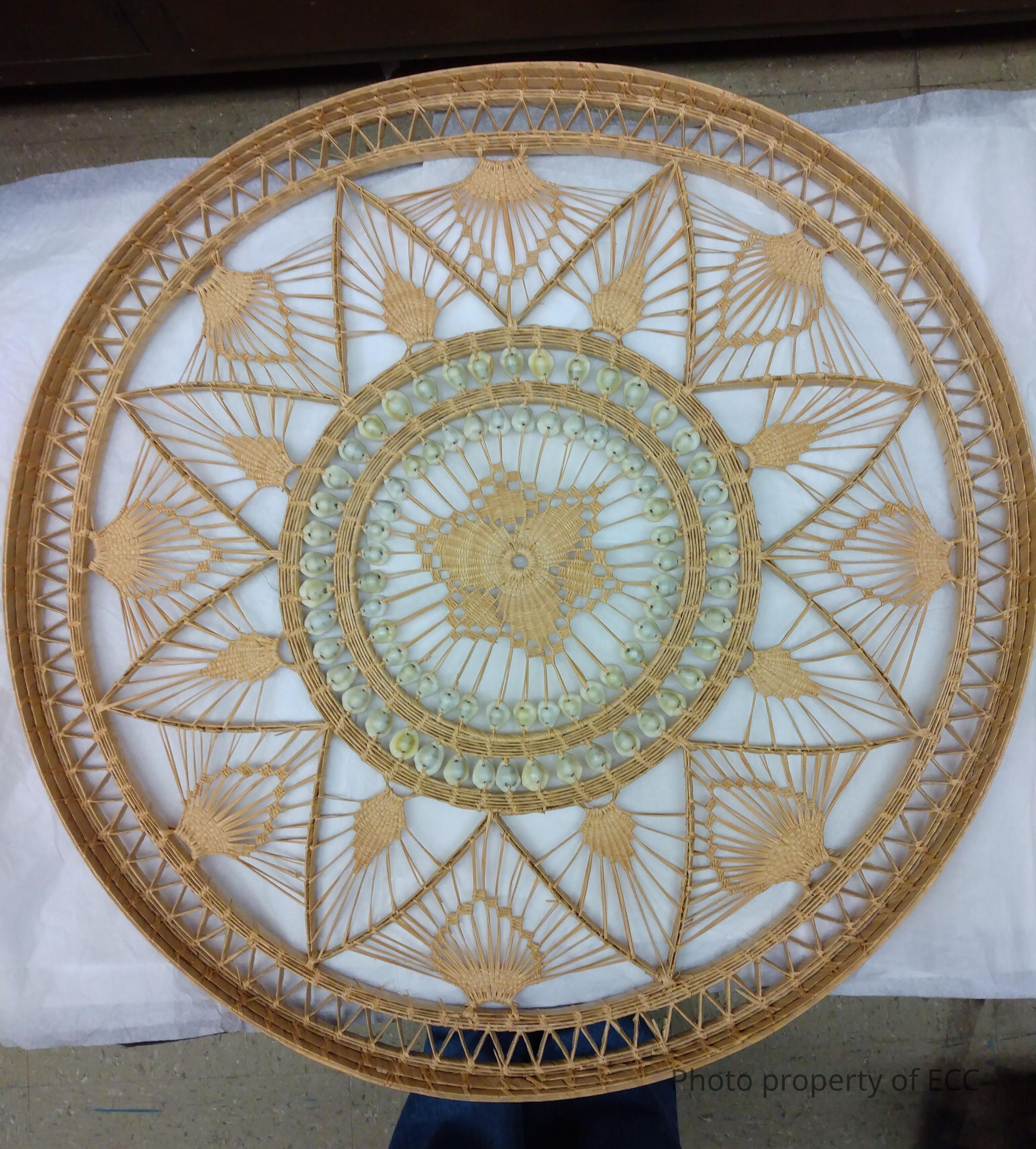 A woven fiber tray made of white ivory tree leaf and cowrie shell. At the center, in the middle of a round pattern, is a plain woven flower surrounded by cowrie shells. It is circled by an eight pointed star pattern, and a fan pattern in between each point of the star.Use