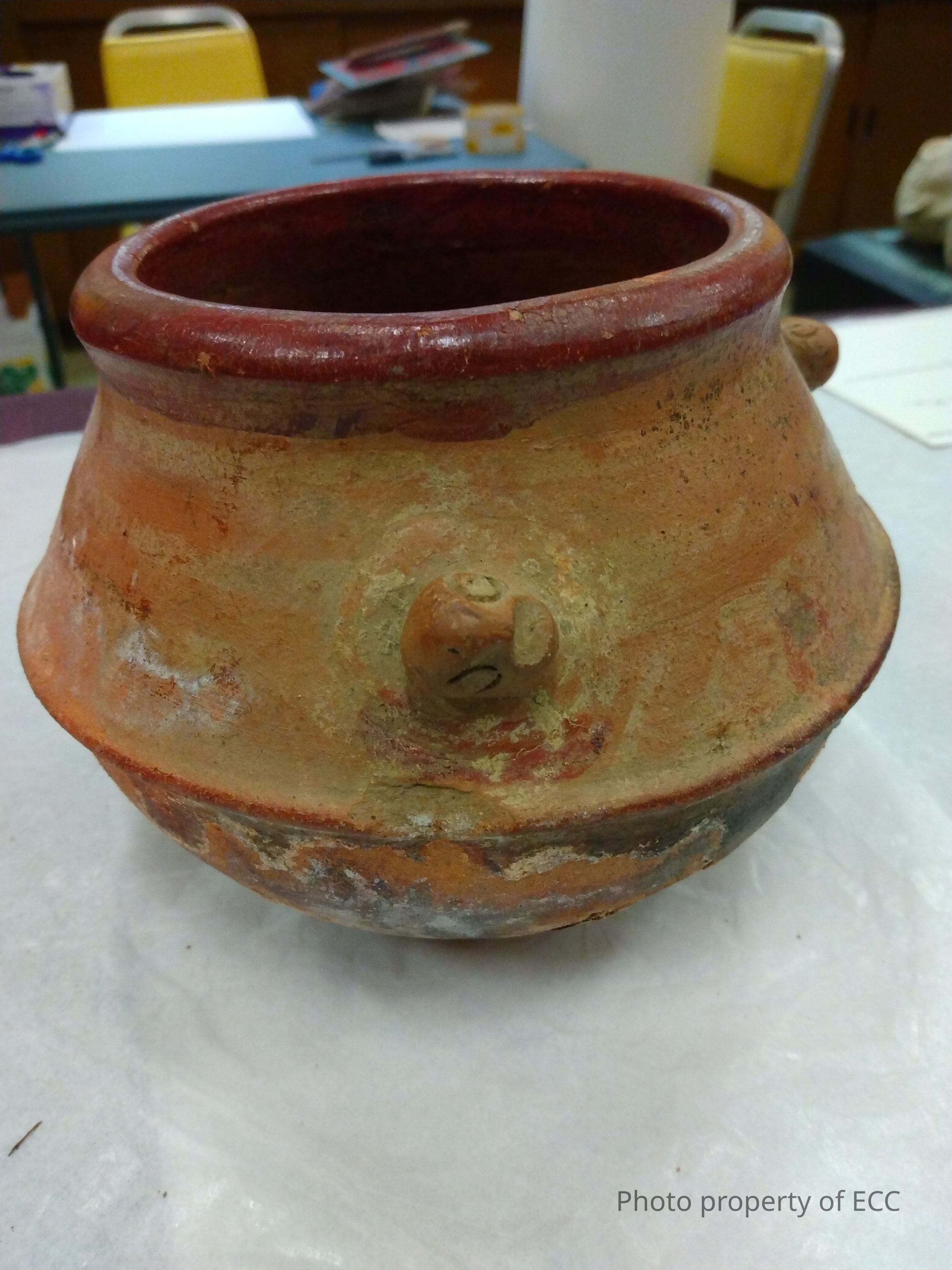 Small pot with deep reddish-brown rim and anthropomorphic lugs. Has a rig around the center; below the ridge is remnants of red and white paint with black vertical lines. Paint is excessively worn away and still chipping. Lugs perhaps depict frogs or birds or turtles.Collection