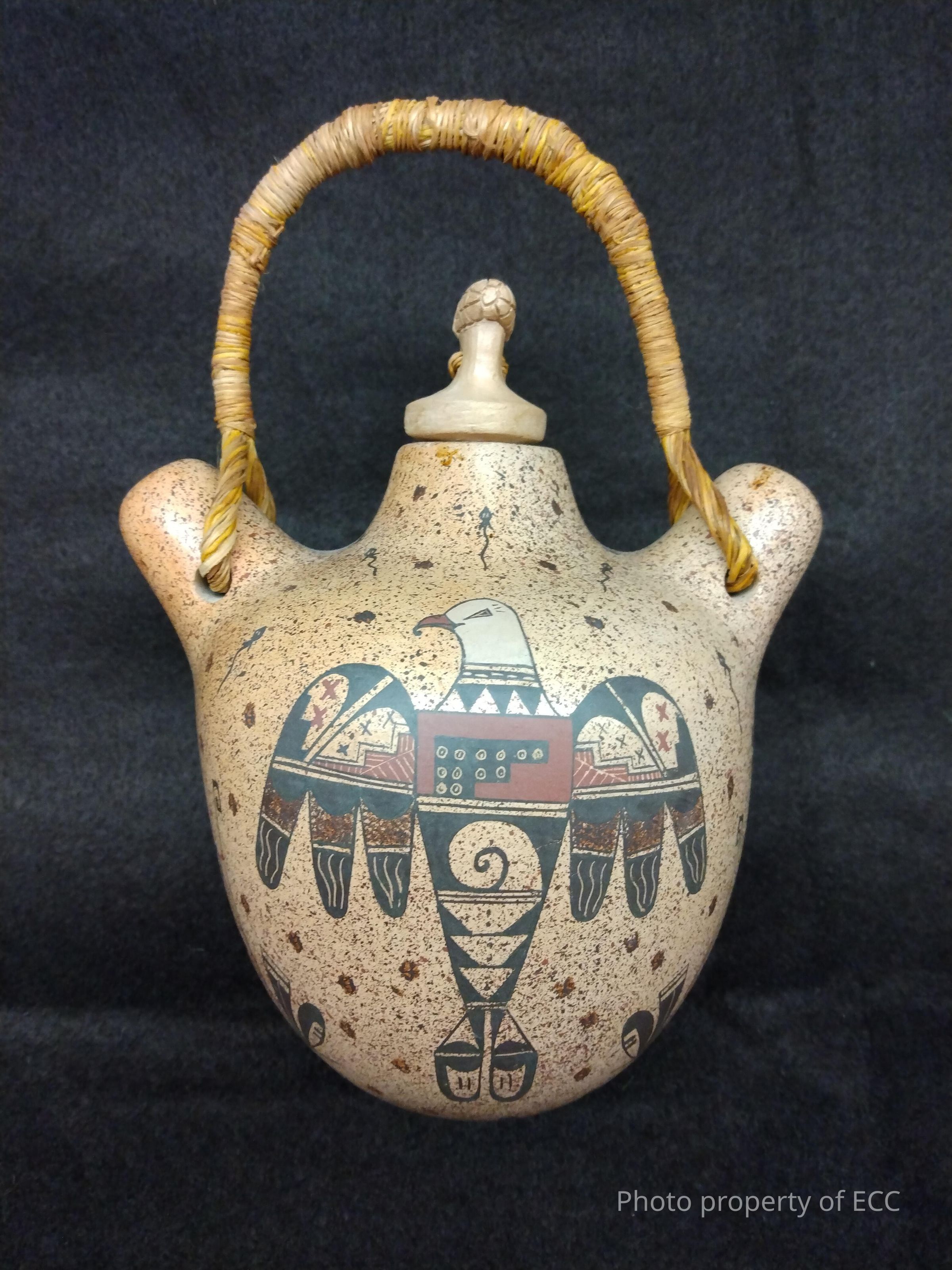 Polychrome canteen pot with painted stylized eagle design, corn cob ceramic lid, and straw handle.Collection