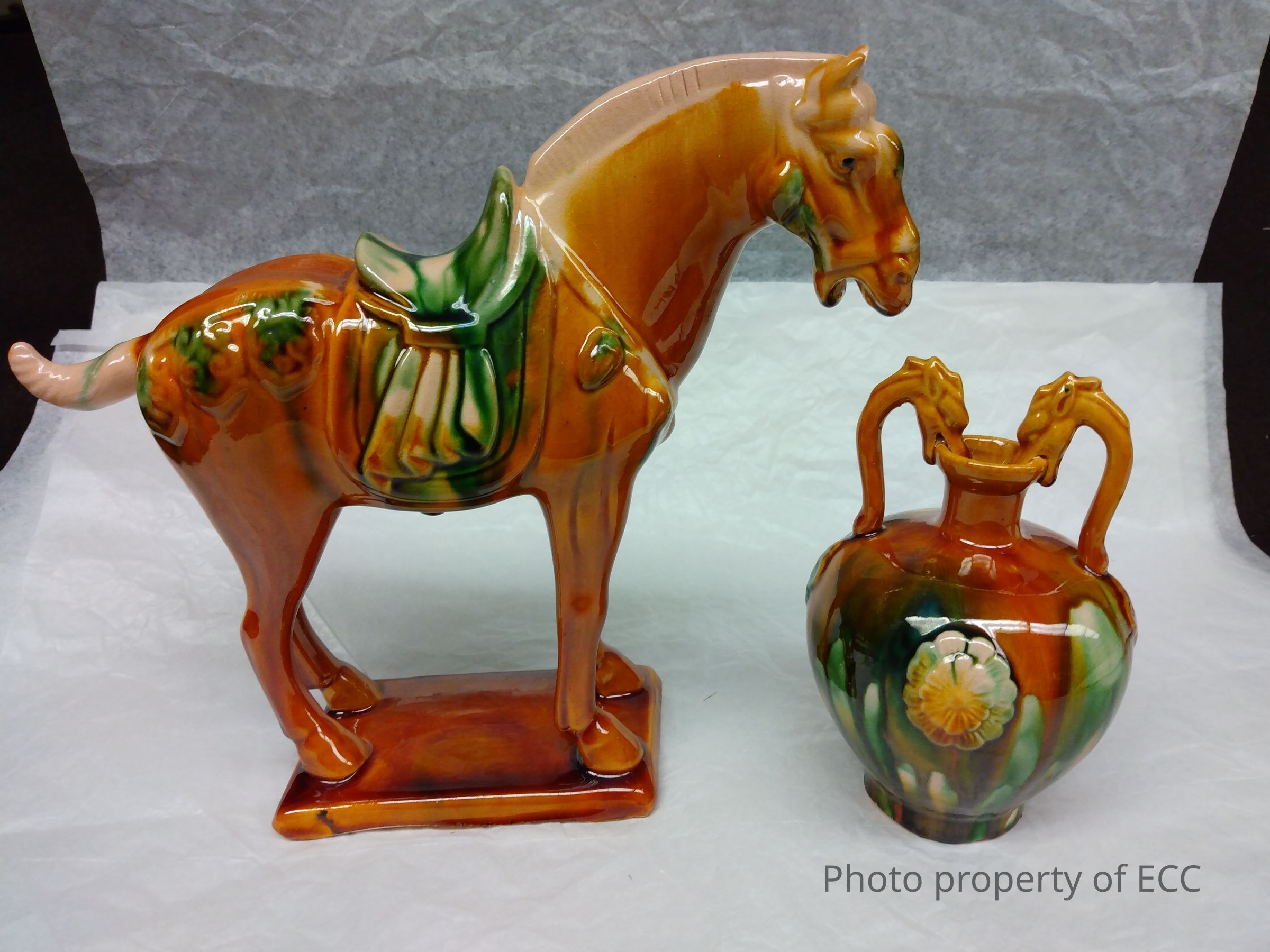 Horse figure is a light brown color with a cream or white mane and tail. It has a green saddle and decorations around its head, neck, and back legs. The vase has two handles shaped like horses heads. It is the same brownish color as the horse and also has some green and blue. there is a flower design on two sides of the vase.Collection
