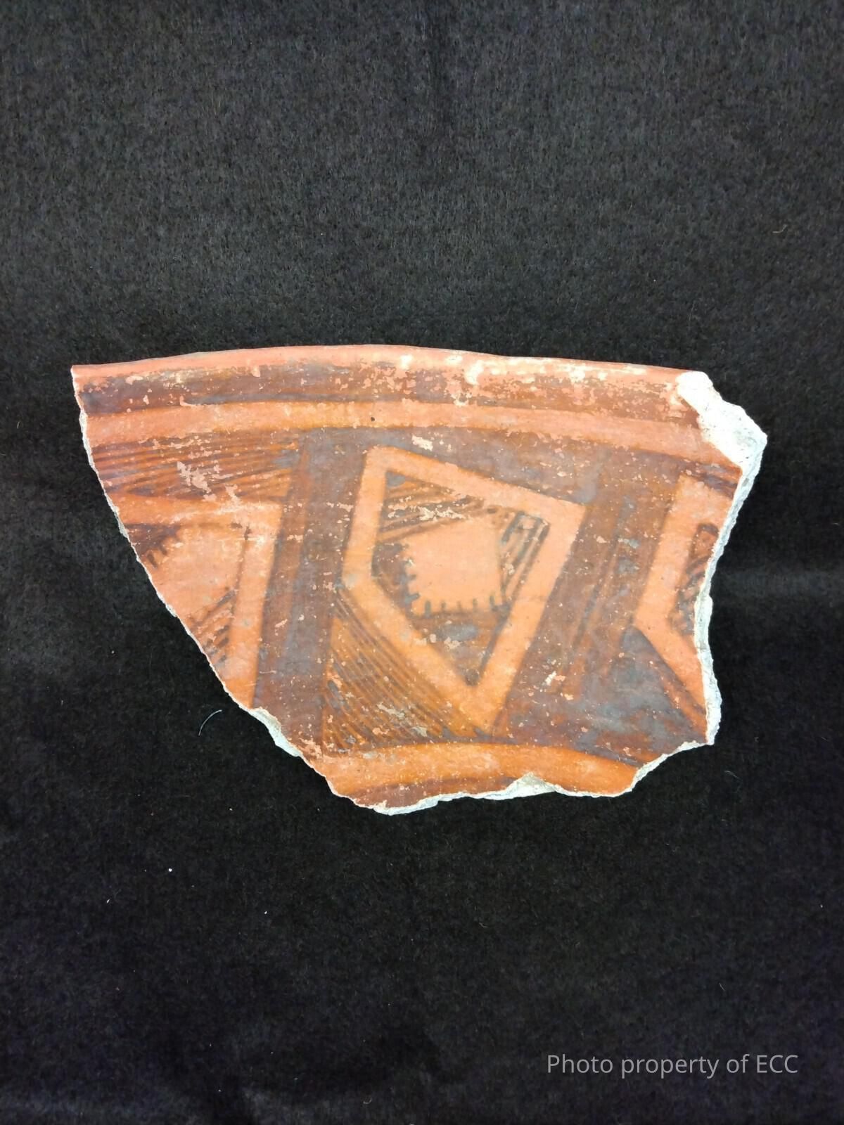 A red pot shard with a black four sided polygon design on the interior. The exterior is red then fades to terracotta, and has a black triangle design.Collection
