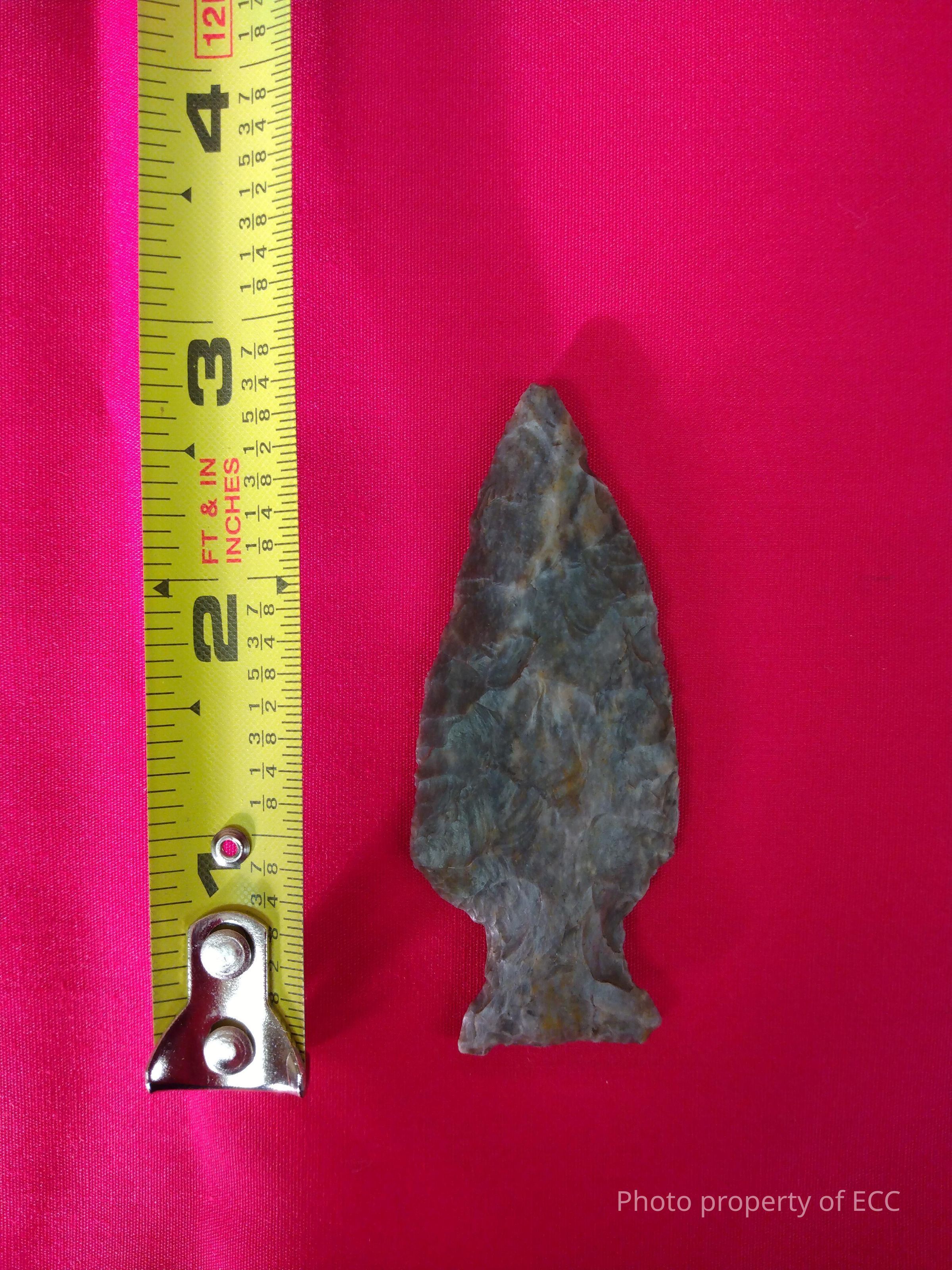 Chert projectile point. Large side notches and a thick slightly eared stemContext