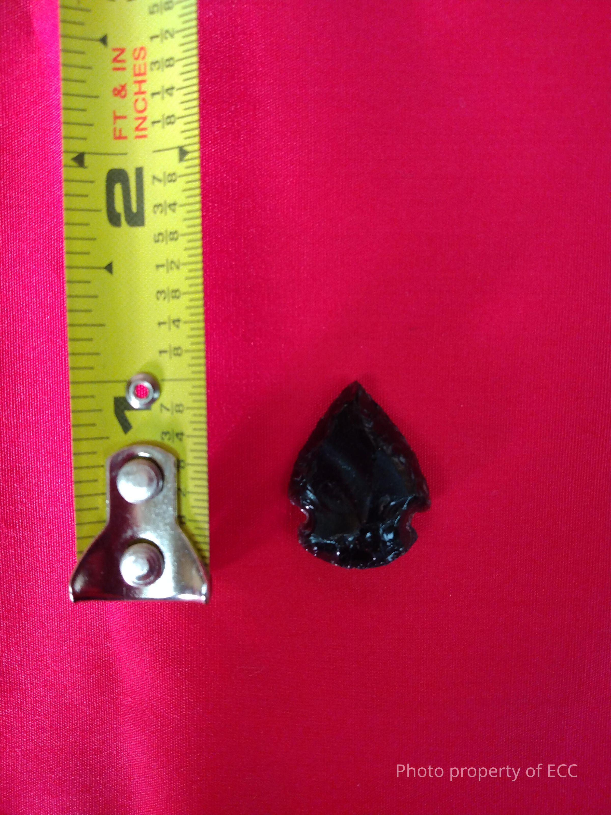 Obsidian projectile point with side notches and convex base.