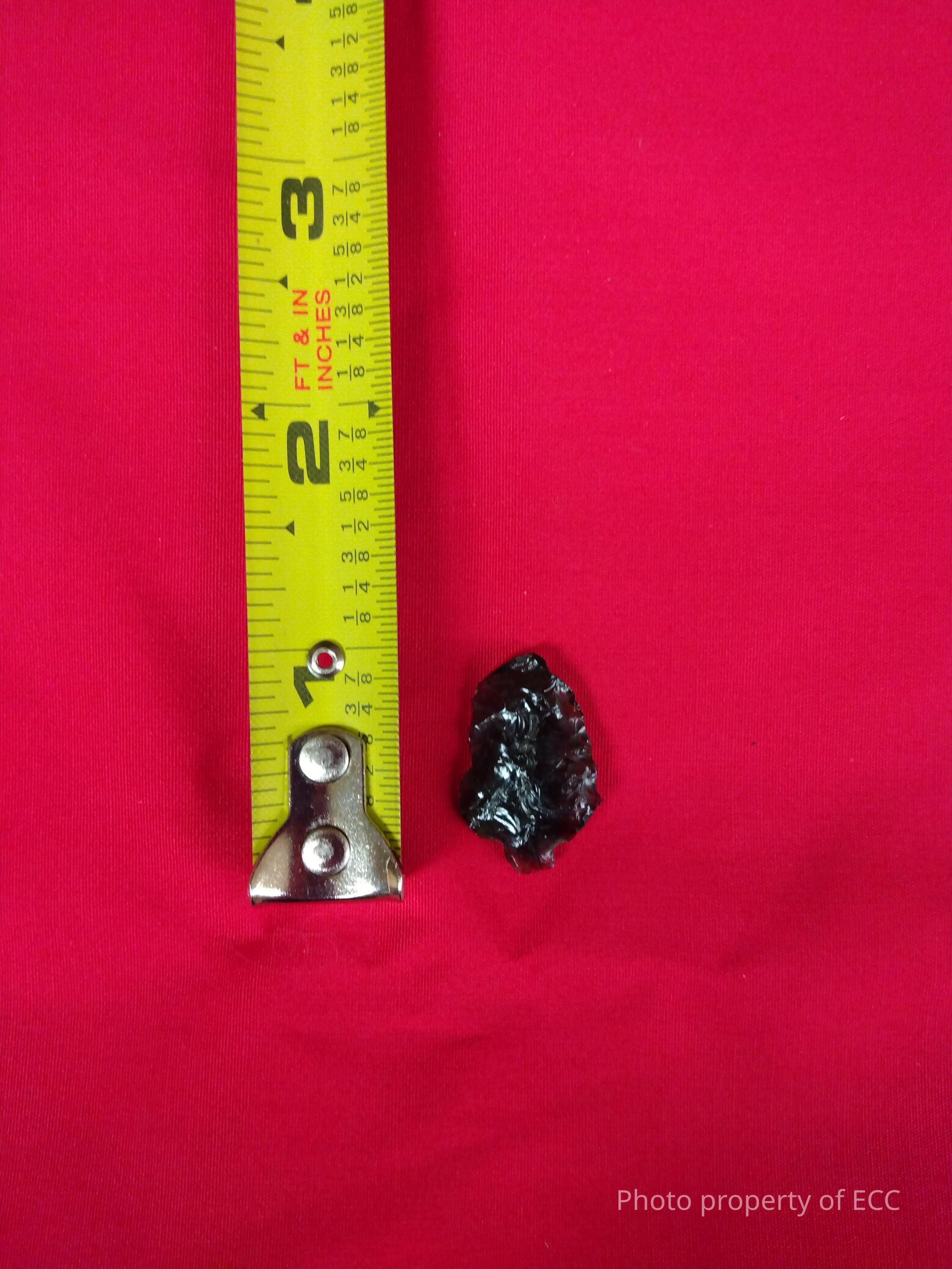 Triangular, obsidian projectile point with small round stem.Collection