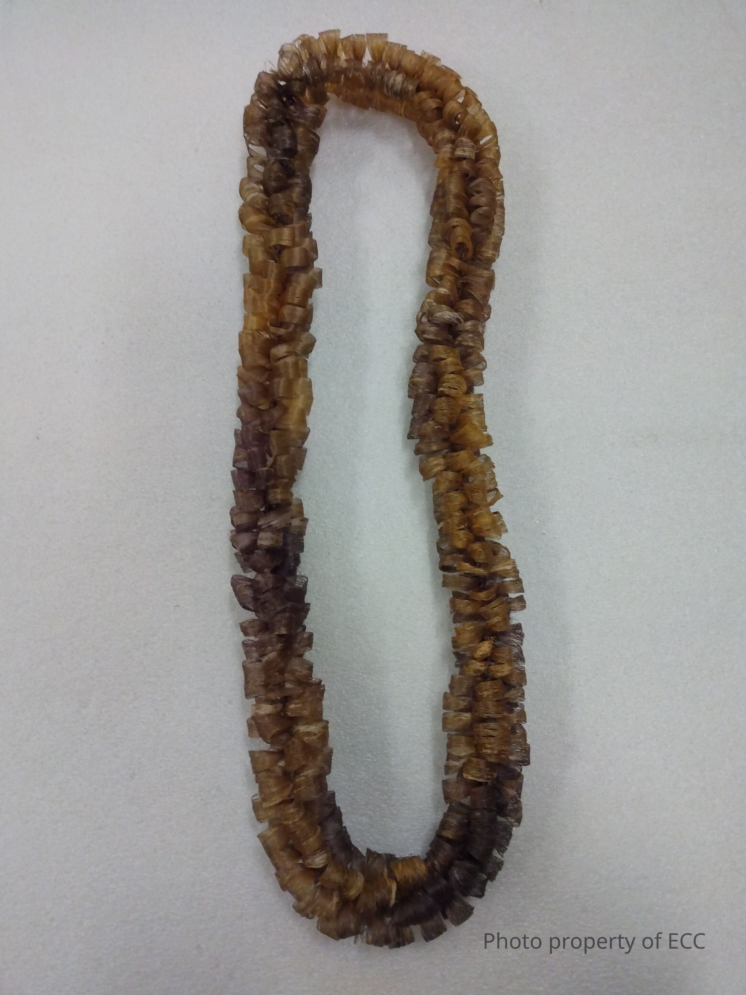 A purple dyed lei made from coconut fiber. The purple color is extremely faded: lei has a more brown and black color. White spots are starting to appear on the fibers, while the fibers themselves are starting to fray.Use