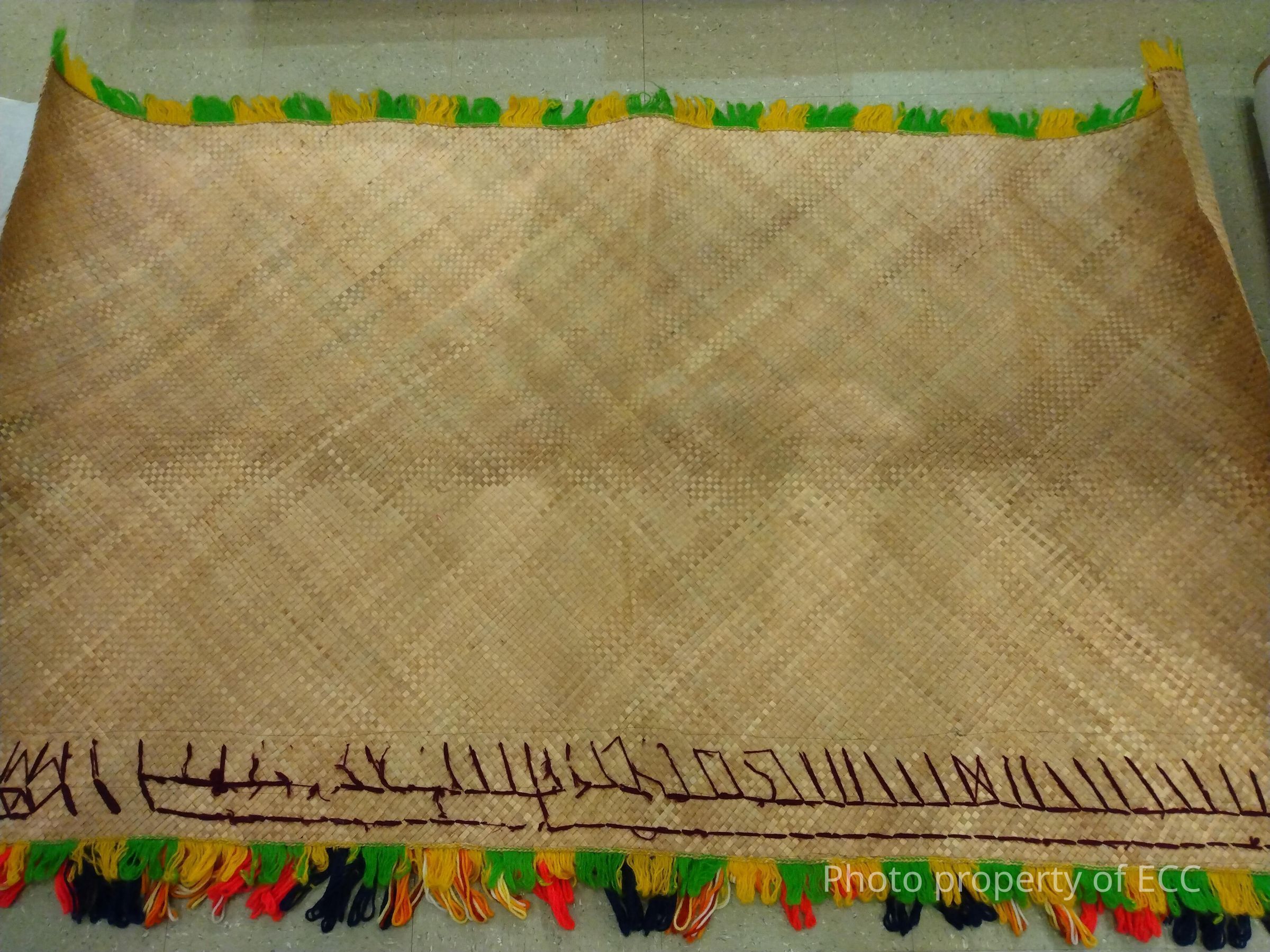 Grass mat, dried commercial yarns. Has yarn fringe of green and yellow along both the bottom and top borders, with three layers of yarn fringe of navy, red, and small sections of yellow, white, orange and dark gold on one side. Along the bottom on