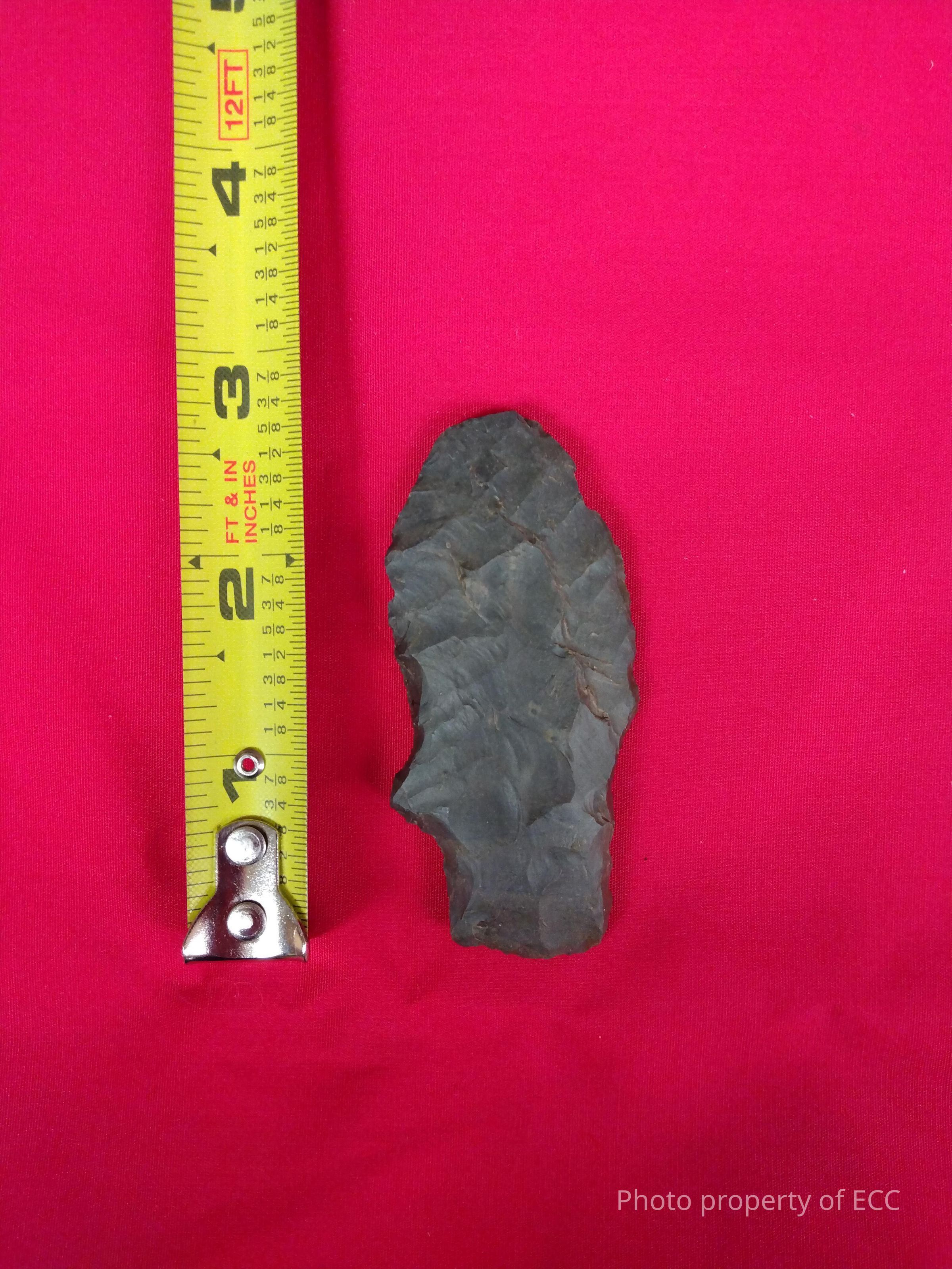 Chert scraper. Pointed, flat base with ear on one side with slight indentation on the other. What looks like a small yellowed piece of tape and paper stuck to one side.Collection