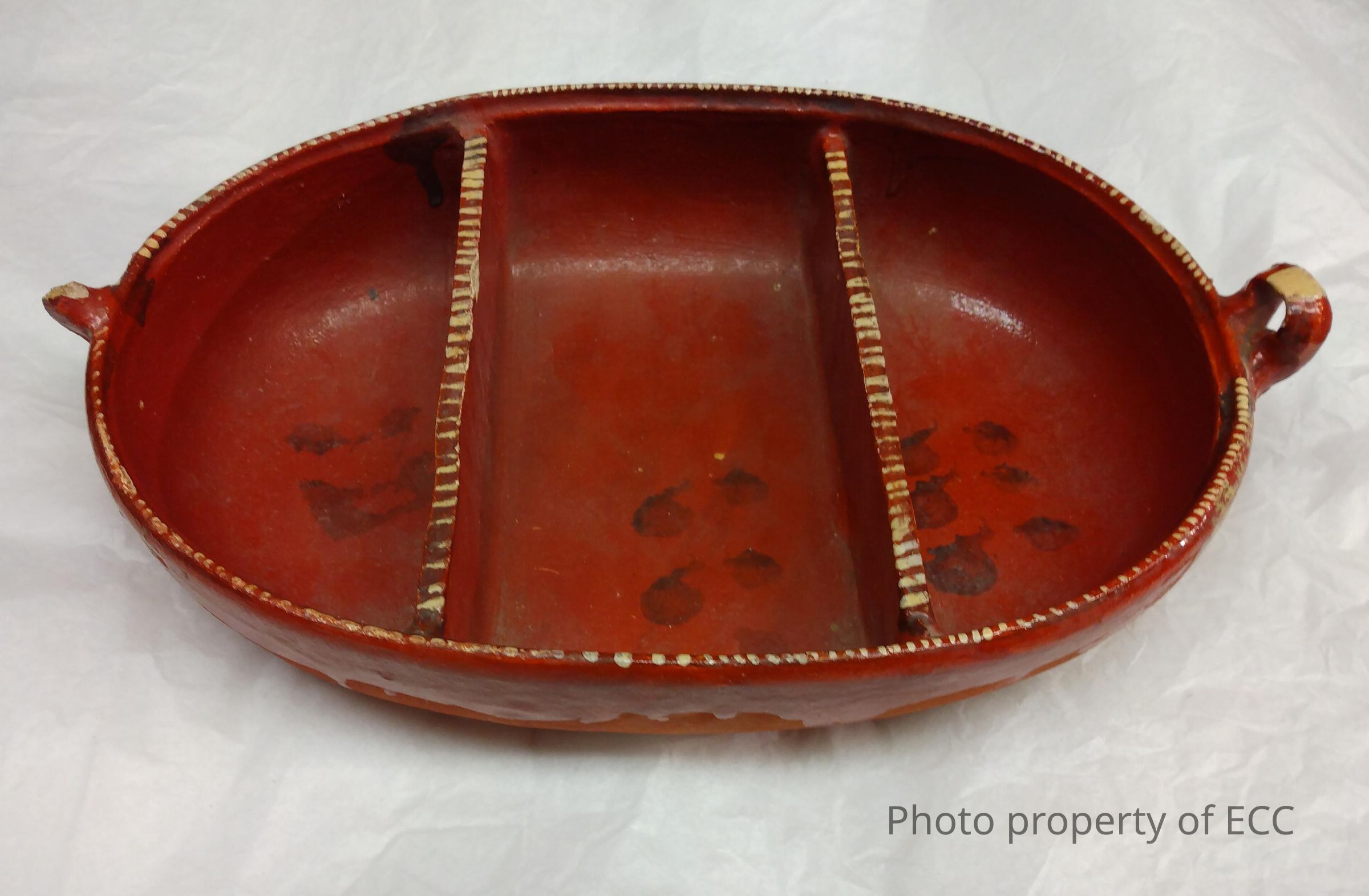 A terracota serving bowl, sectioned into three for various dishes. Two loop handles on each end, one broken. The inside is glazed, while the outside remains natural. Paint in reddish brown, with white dots lining the top edges. Paint job is rudimentary, as if done by a novice. The bottom had numerus scratches, as well as a stamp that says "Mexico".Use