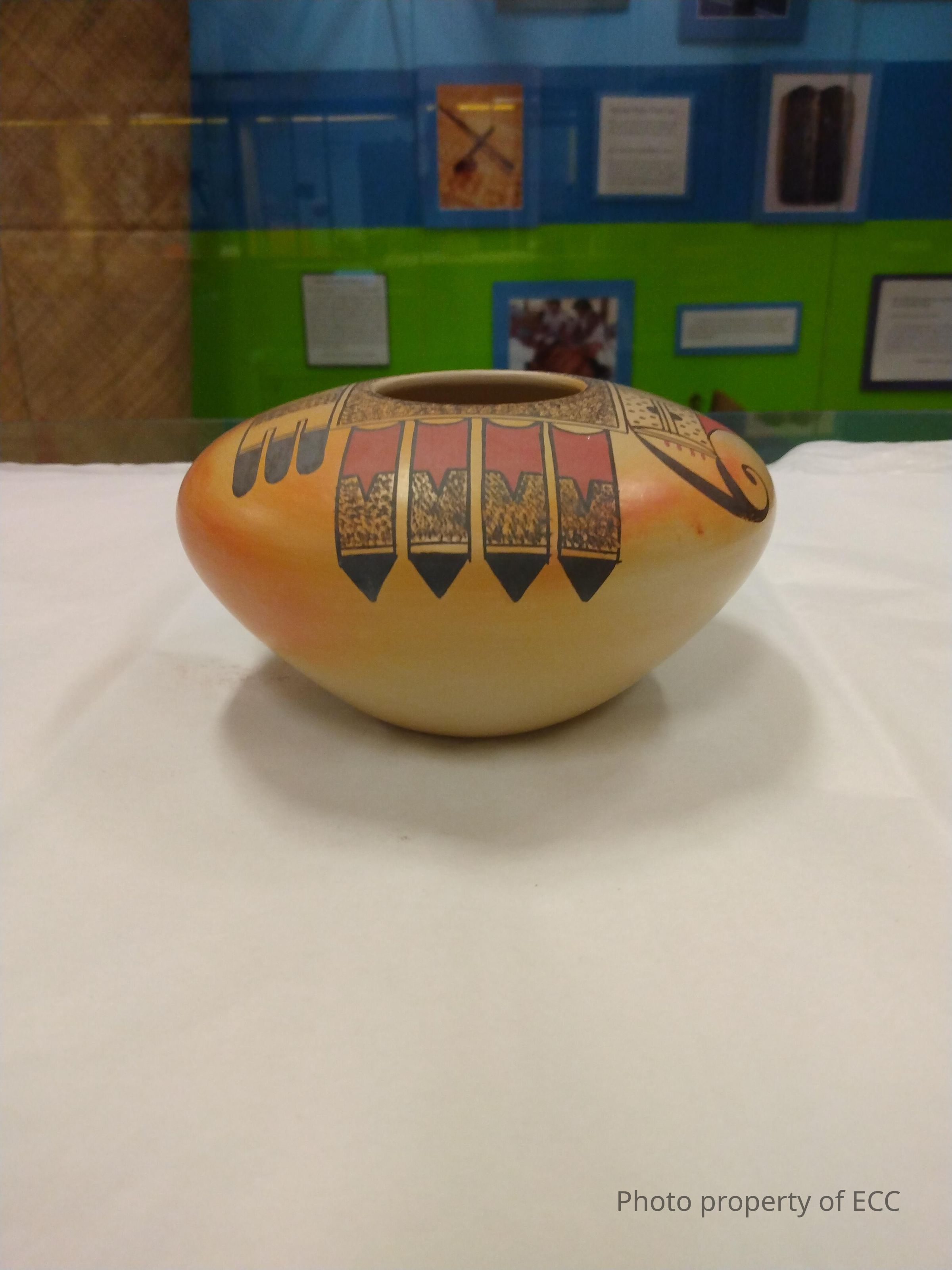 A seedpot with a painted stylized bird design of black and red on buff polychrome. It was handmade via the coil and scrape method using native clay. The bottom is signed "FAWN" for Fawn Navasie, and chili pepper icons.Collection