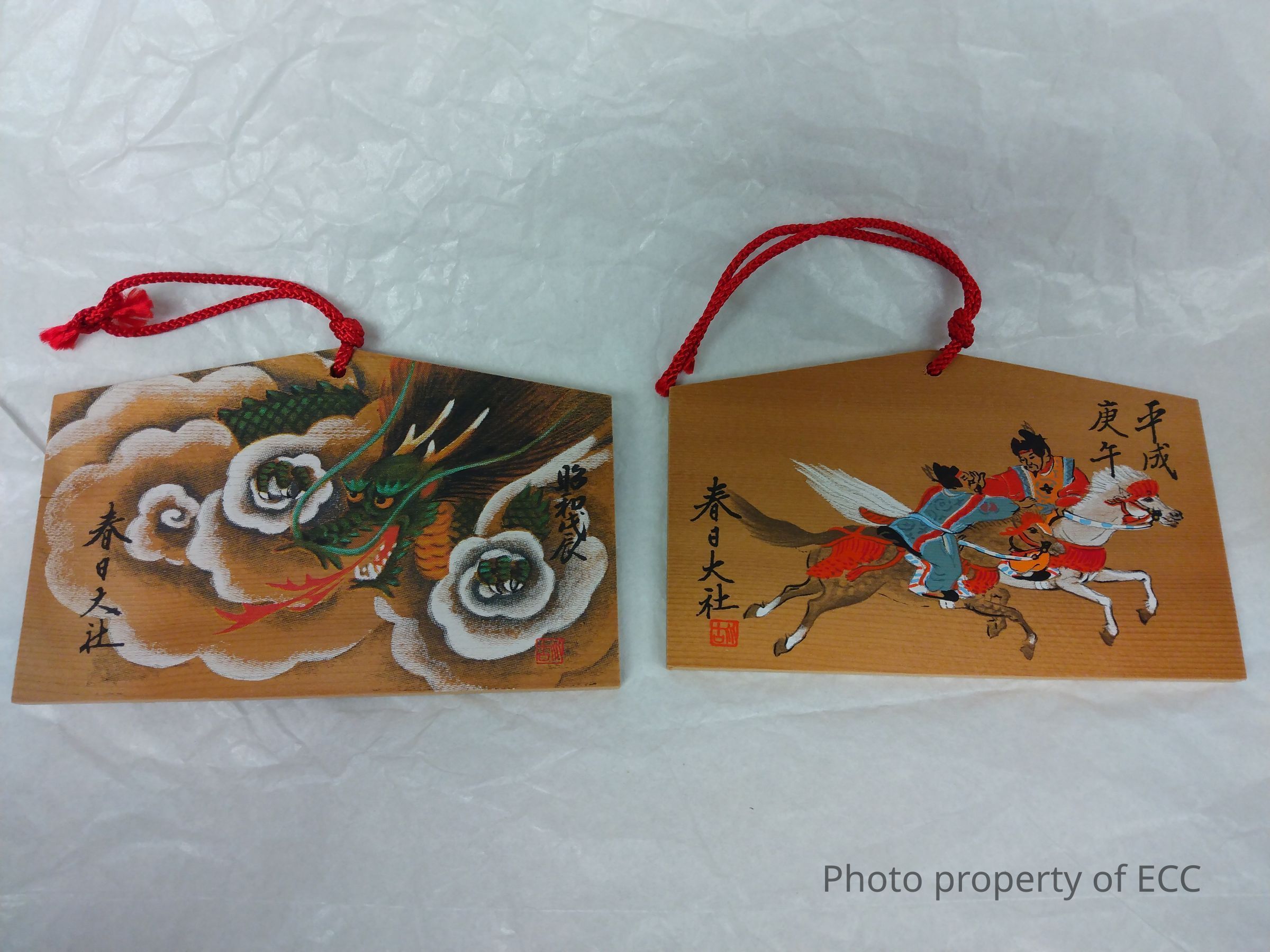 Charm A depicts a green and yellow/gold dragon in the clouds with a long red tongue. There is writing on the left and right sides of the charm. There is a small hole at the top where a red string is so the charm can be hung. Charm B shows two men riding horses. The men are dressed in blue and red robes. One horse is brown, the other is white and both are wearing red tassels. Faintly written on the back of the charm is "1990 May Ray and Z continue to be healthy and happy." There is a hole at the top of the charm with a red string to hang.Collection