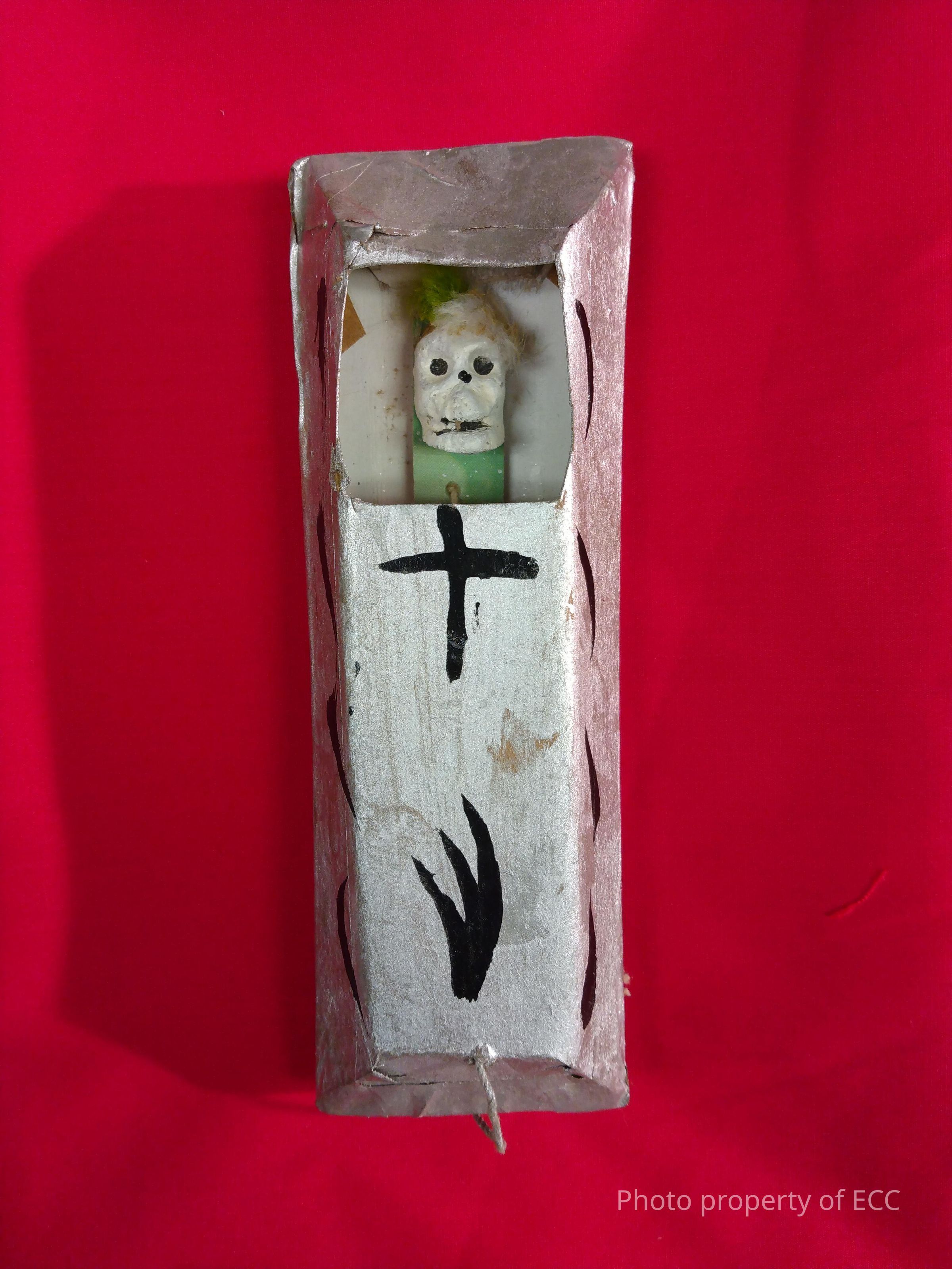 Small silver coffin with black markings in the side. A cross is on top. Window looking into coffin shows skeleton's skull. There is a string coming out of bottom of coffin, which if you pull, the skeleton's skull comes out of the window.Collection