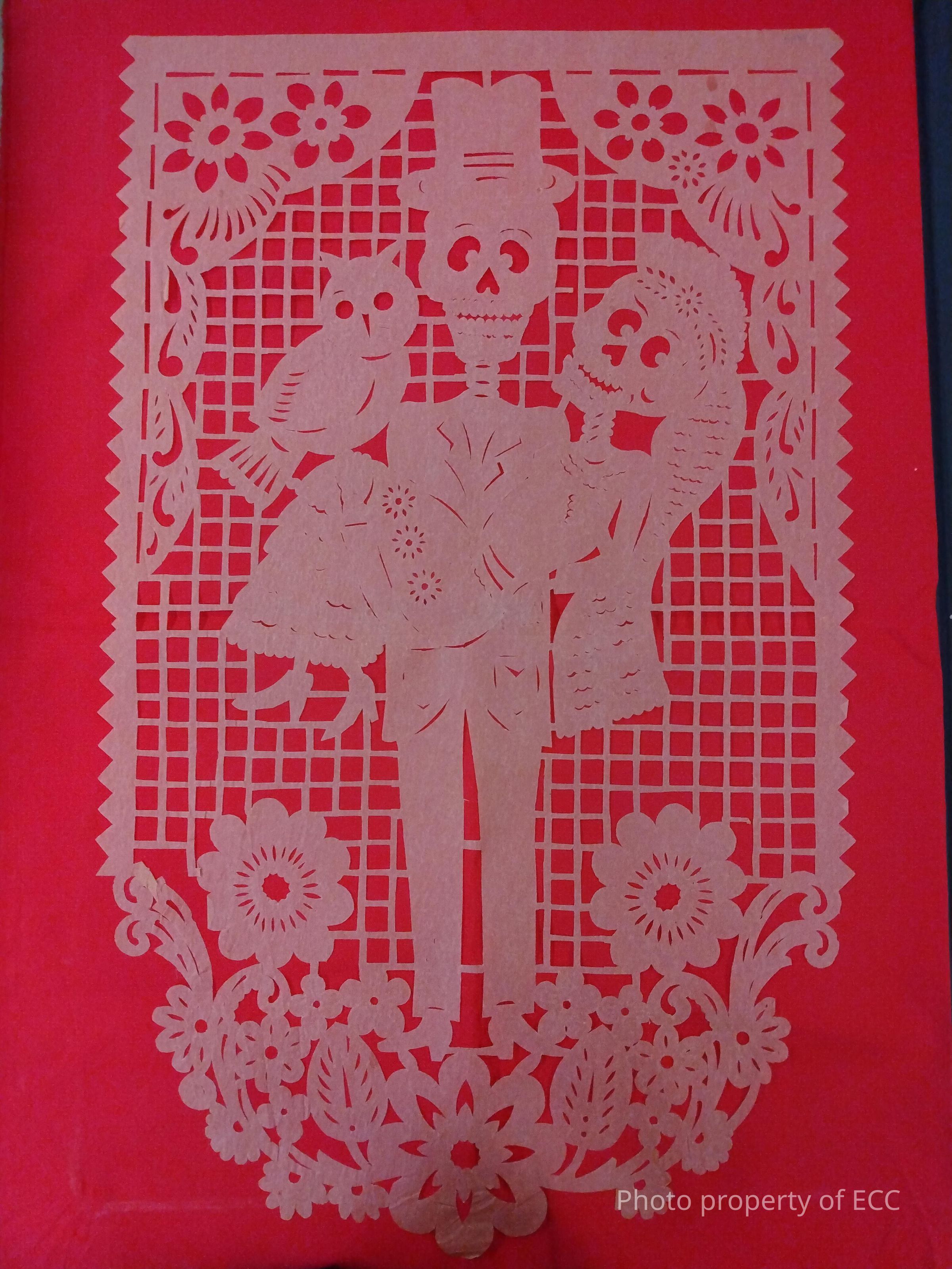An orange sheet of papel picado that shows the wedding of a skeleton man and woman. The man is wearing a top hat and a suit, while the woman has a vail and dress. An owl is perched on the woman's knee. See the link below to learn more about papel picado.Collection
