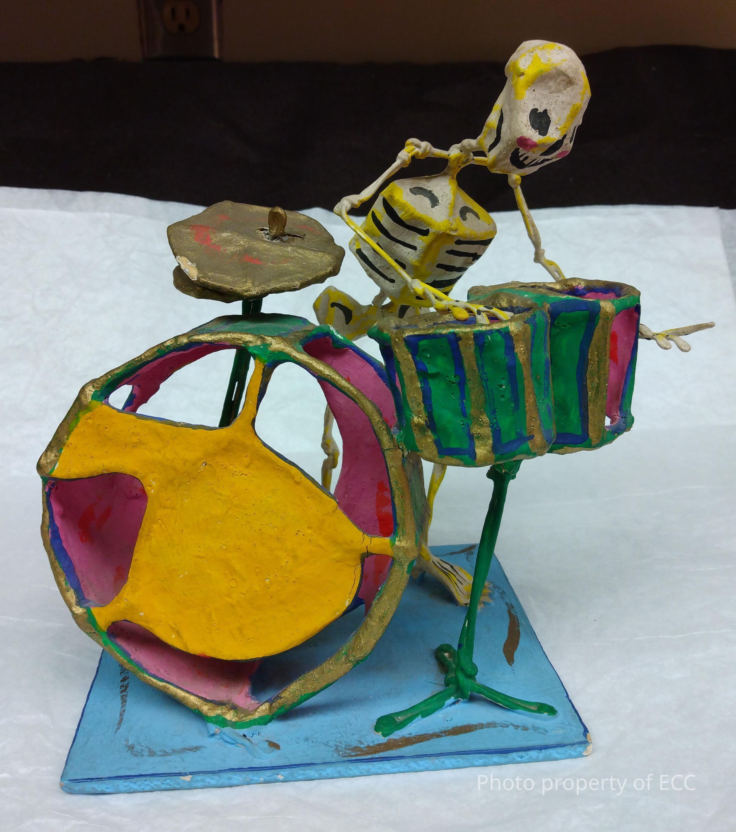 This paper mache sculpture of a skeleton playing drums is drenched in color. The skeleton and drum set sit on a blue wooden base, while his drums are yellow, pink, and green, with gold and purple accents. The gold cymbals on the drum set are slightly movable.Collection