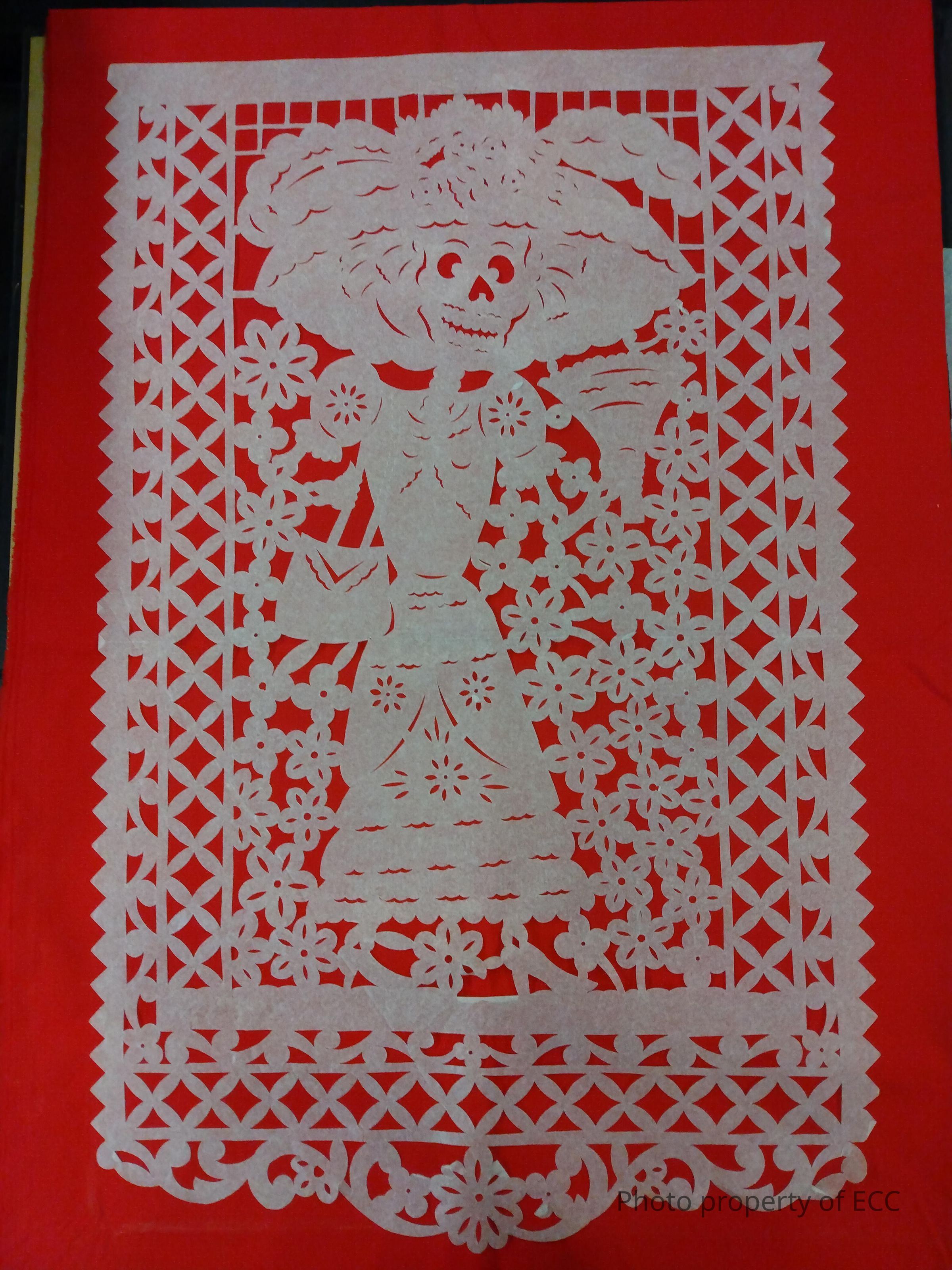 A white sheet of papel picado that shows a skeleton woman wearing a large hat and carrying a fan and purse. She is surrounded by flowers and depicts La Catrina, see link below for more info.Collection