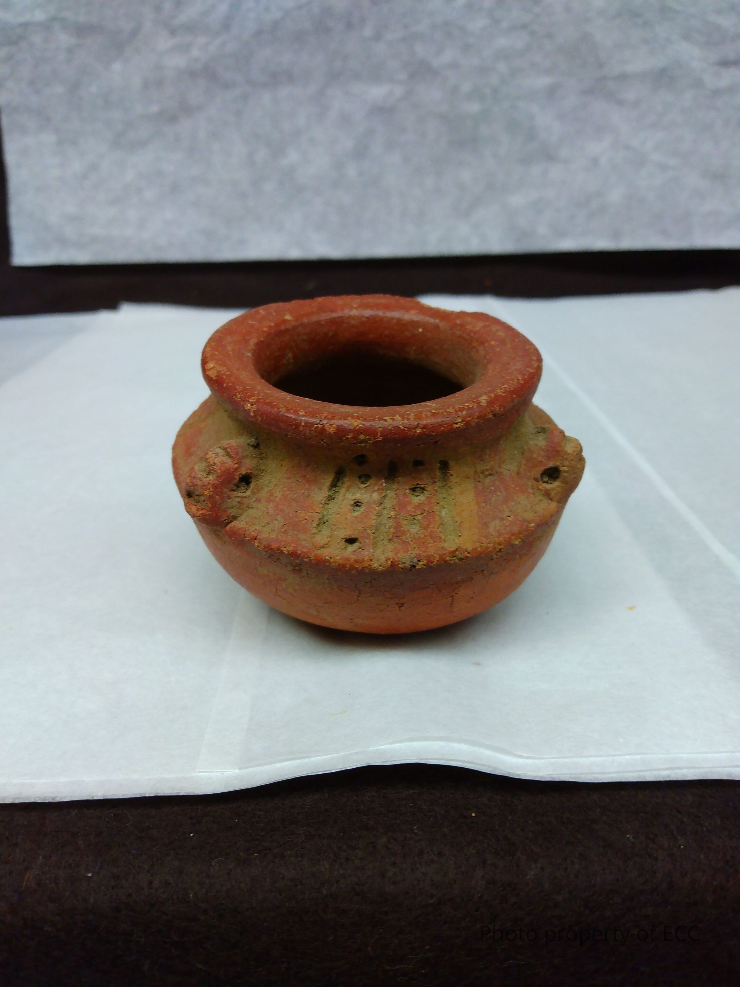 A small round pot with a design below the rim which includes dots and lines. Decorations have seemed to be worn down. Part of the rim has chipped off on one side. It has an overall reddish-brown color with bits of orange hues. Appears to be dirty on the inside and below the rim. Three small nodules around the exterior of the pot resembling a fish-like creature.Collection