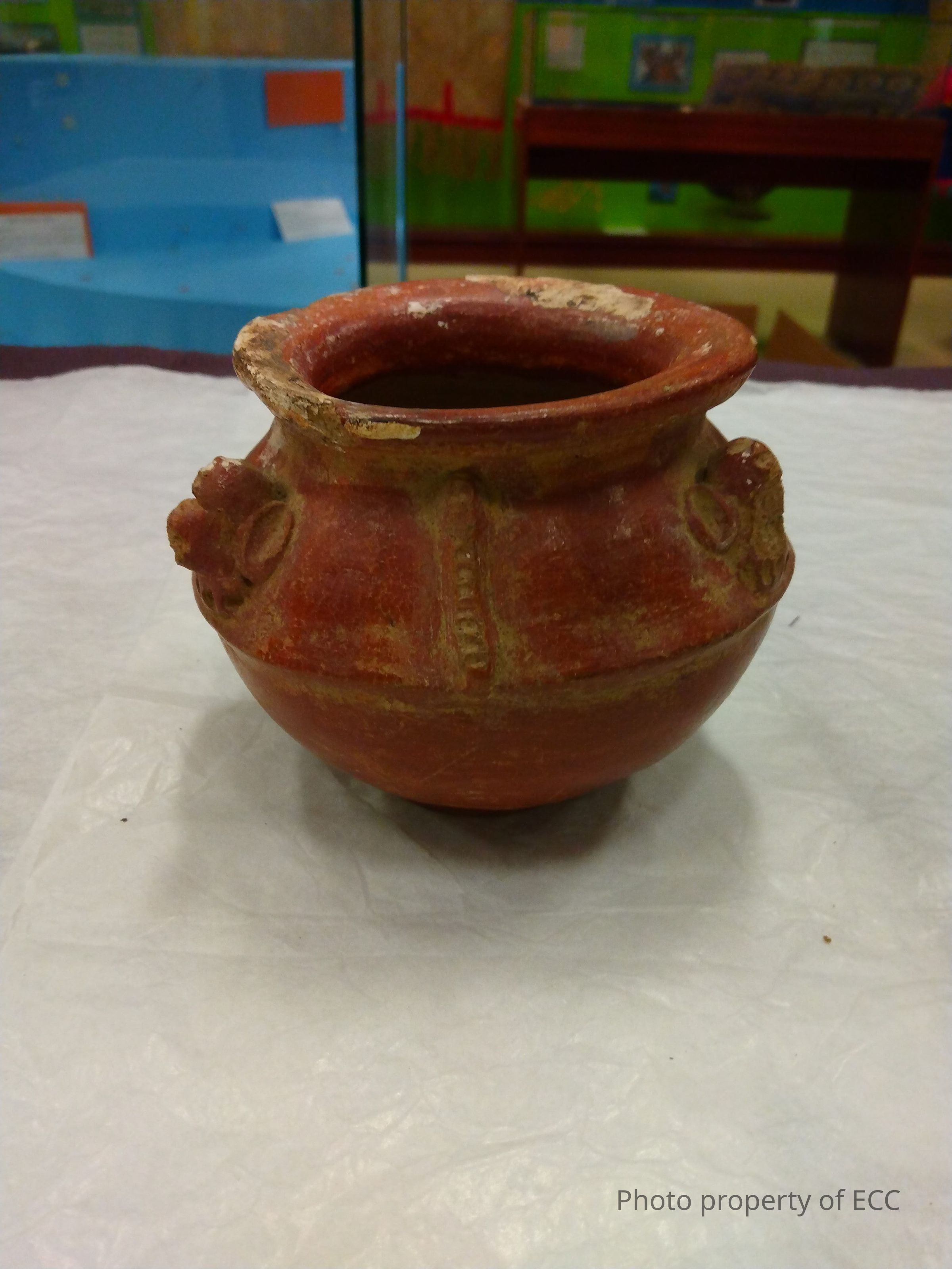 A small, red-slipped pot with a flared rim. Three design fields are separated with three vertical and one horizonal ridges, while the three fields house three lugs in the form of what look like zoomorphic monkey heads.Collection