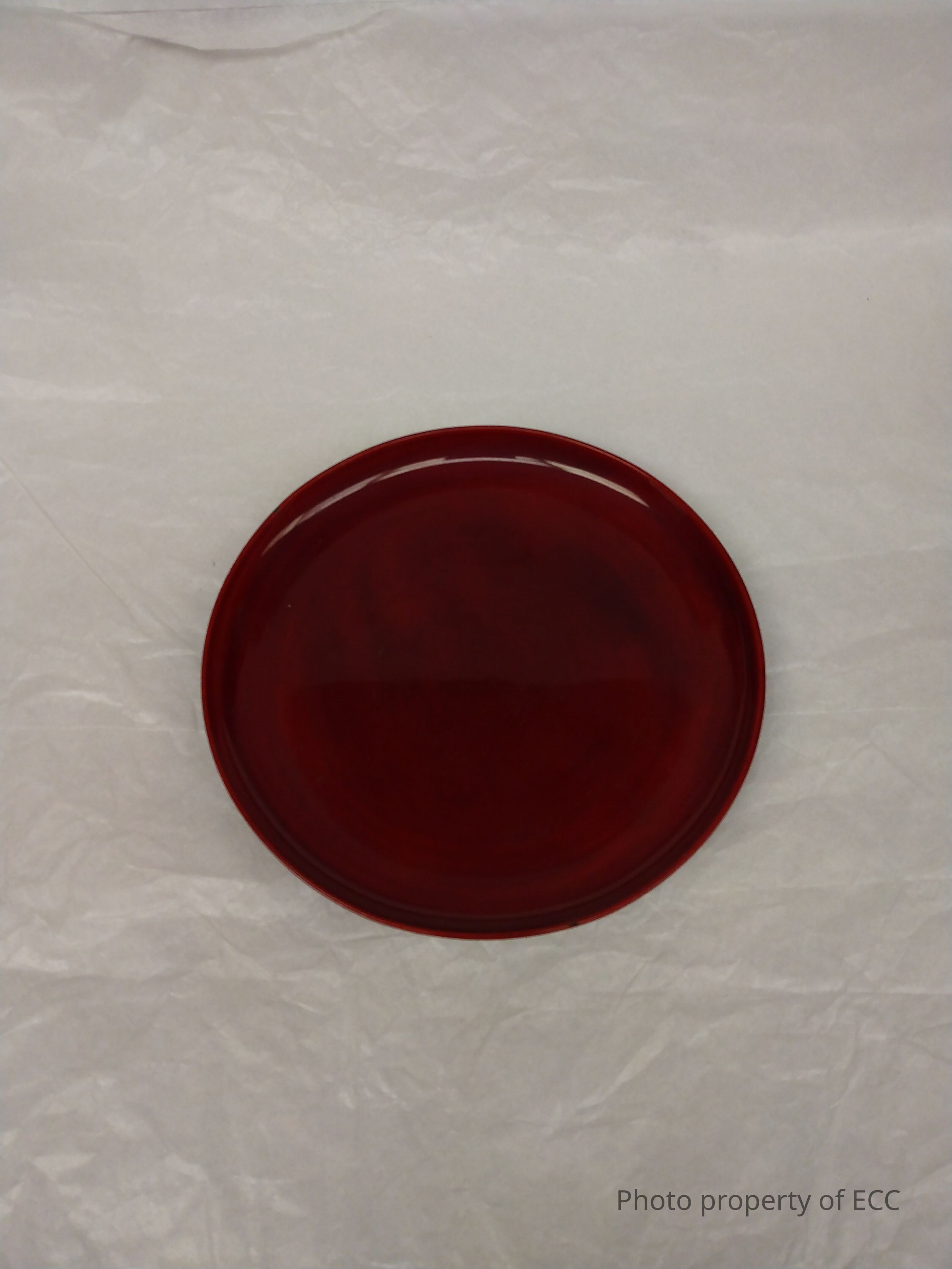 A small brown lacquer or acrylic serving plate. Possibly donated by Mariko Moriyama for the Echoes of Han, 1999 exhibit.Collection