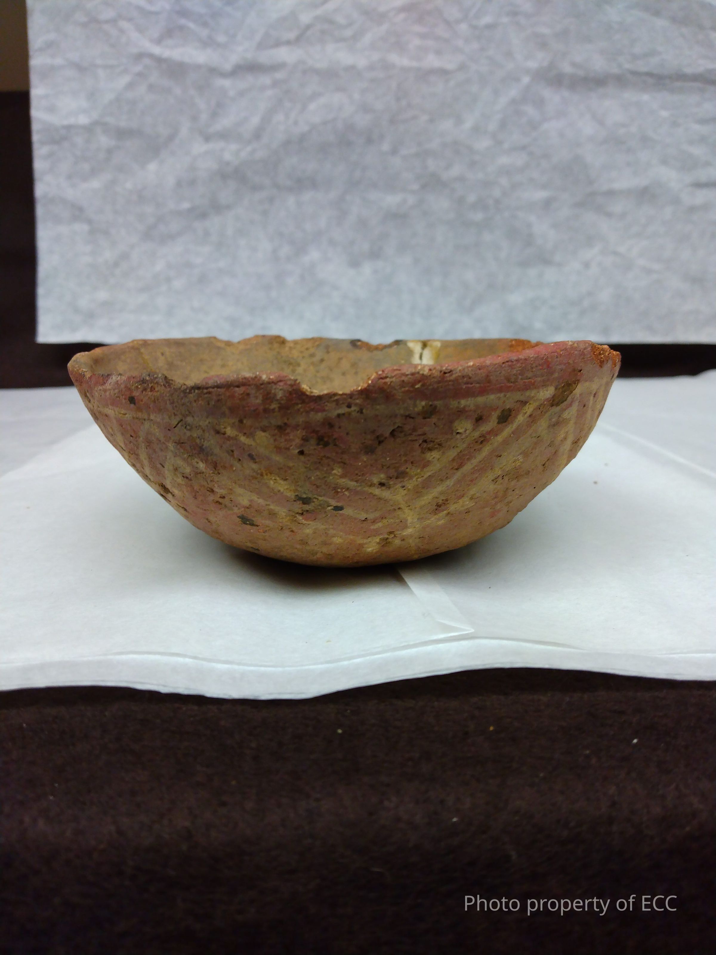 Small bowl colored red with white linear and spotted design. Fire cloud spots dotted throughout, various scrapes and chips along rim and body of bowl. Damaged and badly repaired at some point; glue is visible.Collection