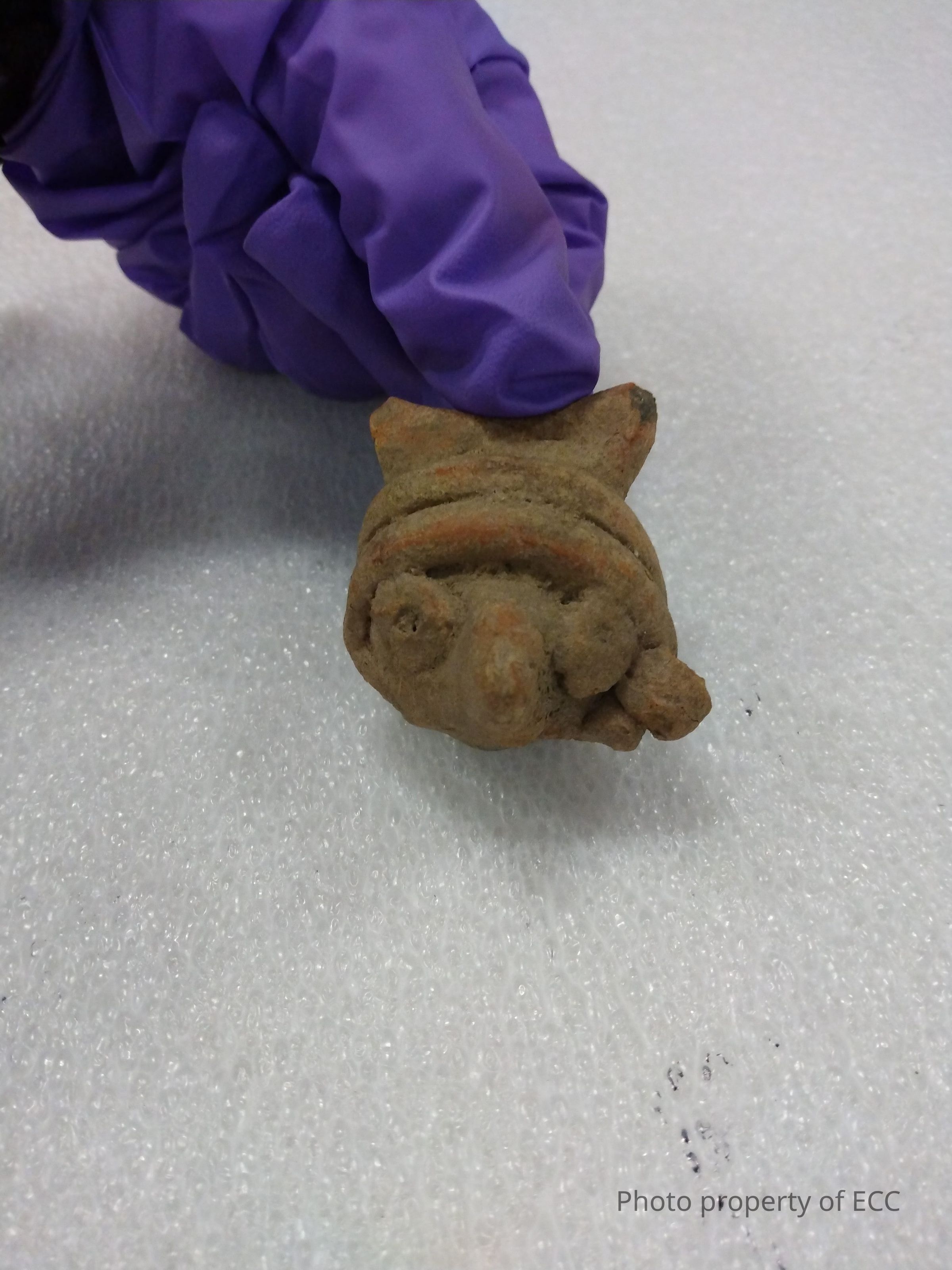 A small ceramic head with a beak-like nose and wearing a double headband surmounted by what could be either a hat or horns. He also wears ear spools, though one had been broken off completely. The original red color has been worn away by soil adhered to the surface, but a bit can still be seen across the front of his head band. He has a small hole on the back that is open, perhaps in order to hang him for display or other purposes. The whole bottom left side of his face is chipped off, while the tips of the "horns" are battered. His right ear spool is chipped toward the back.Collection