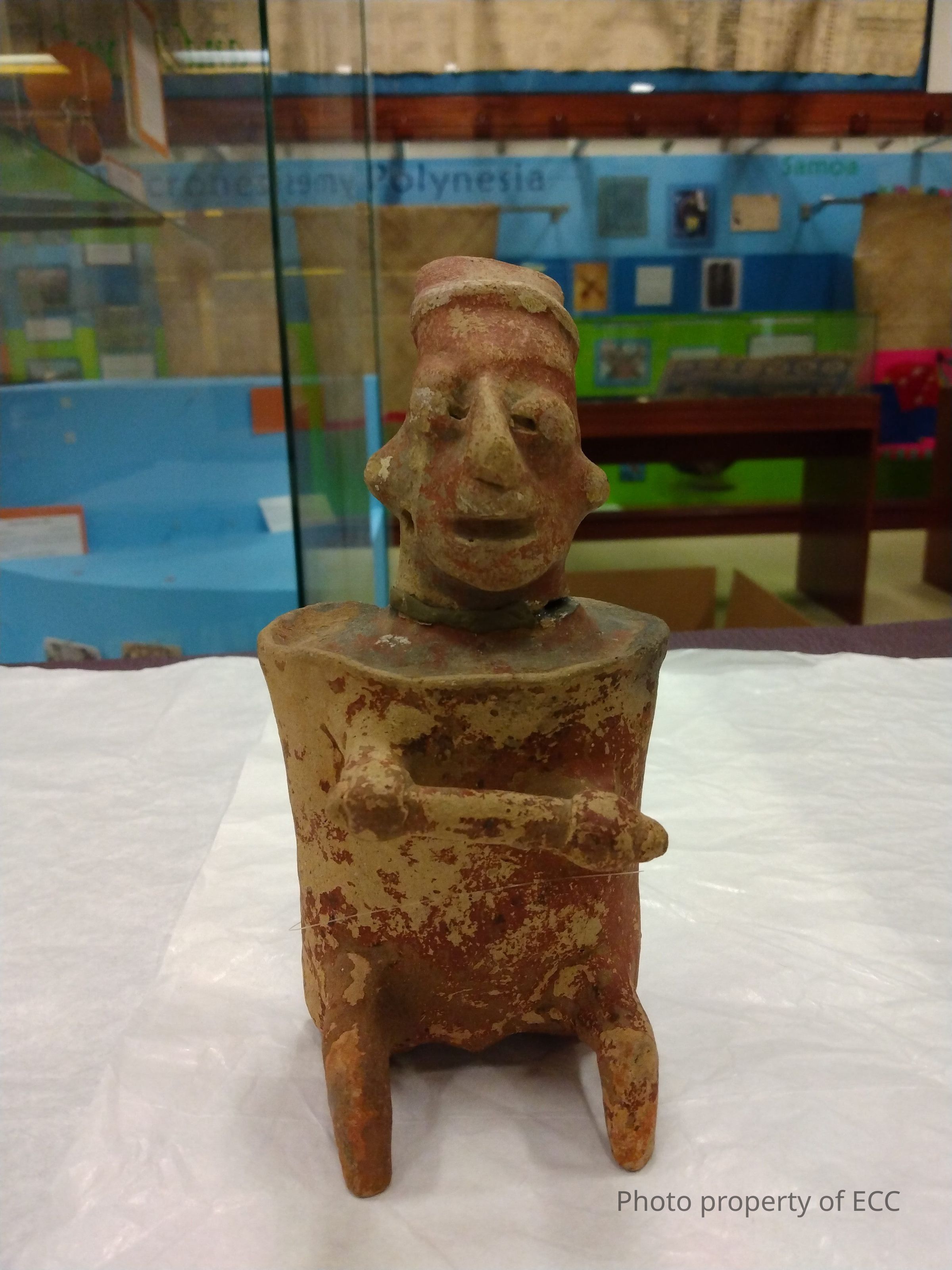 Hollow figurine of a seated man holding a rod. Red slipped. Body is cylindrical with a raised upper rim. Appears to wear a hat. Face seems to be smiling.Collection