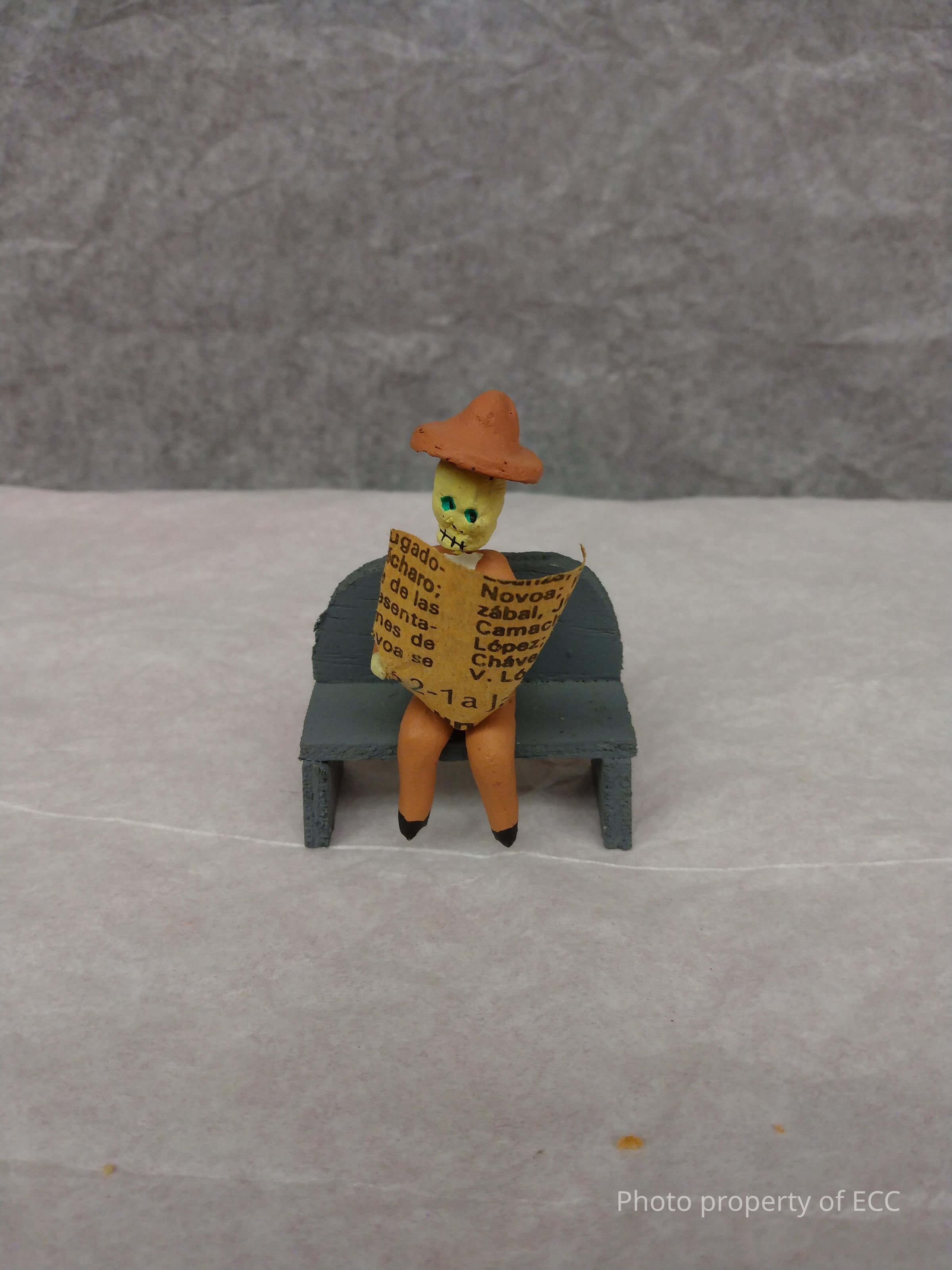 Small skeleton man with tan suit and hat sitting on grey bench reading a Spanish newspaper.Collection