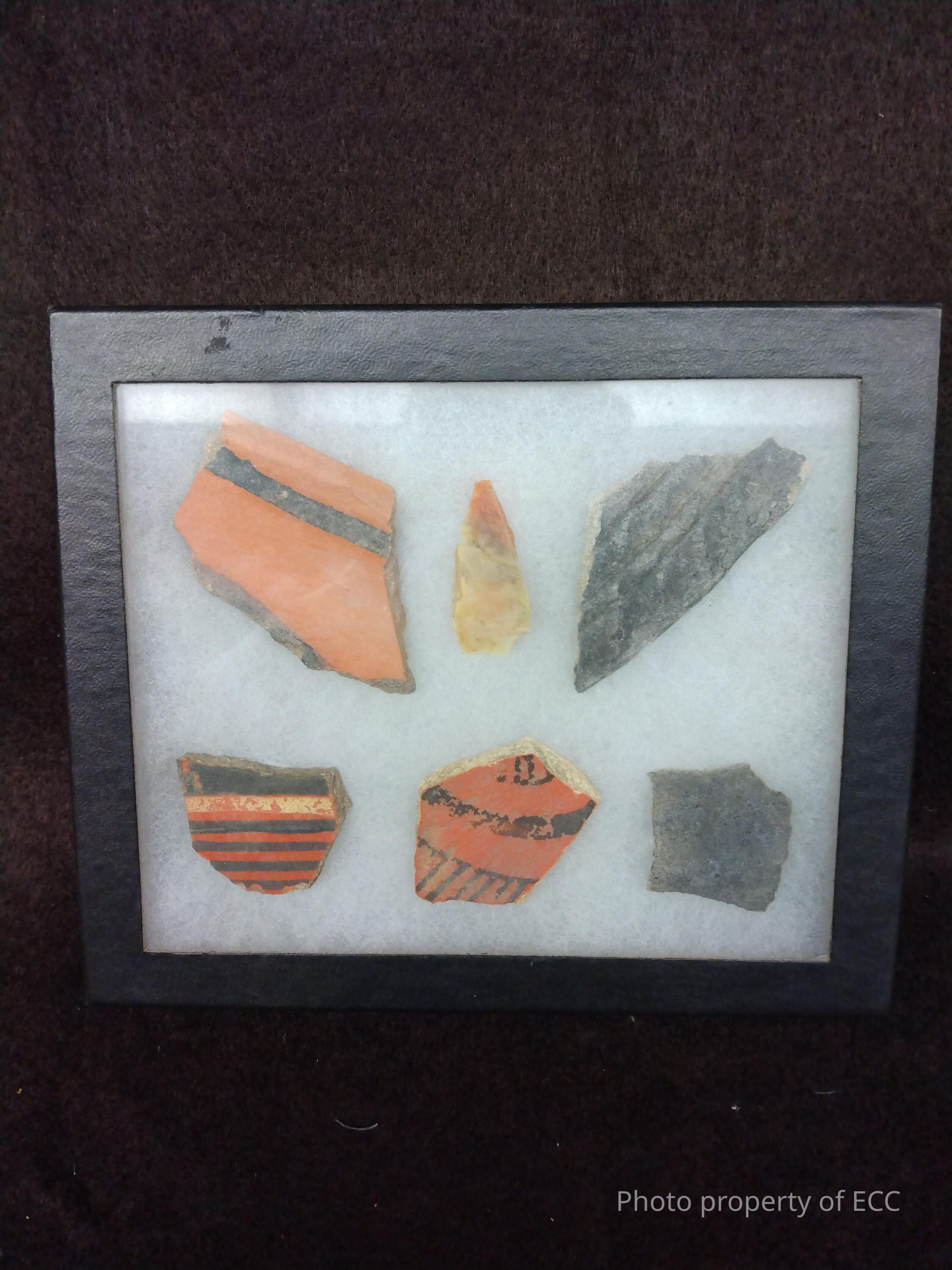 A specimen box with five pot shards and one projectile point. Of the five pot shards, two are black and three are red.Collection