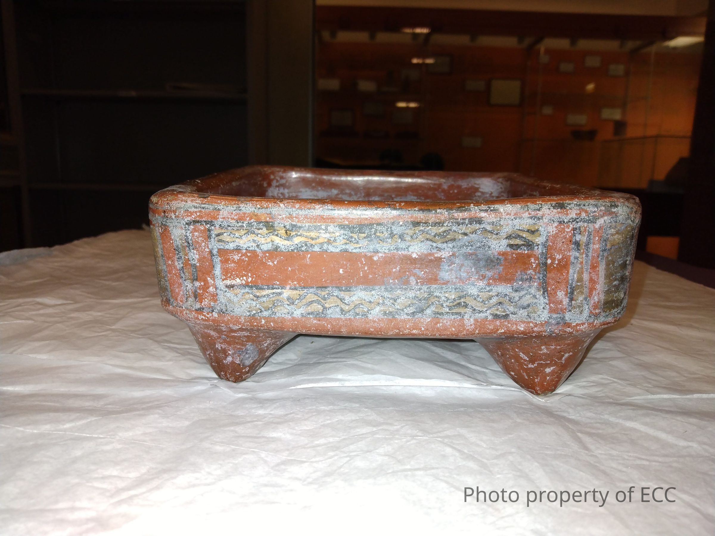 Polychrome square-tripod bowl. Legs are hollow. Evidence lime deposit along all four sides.Collection