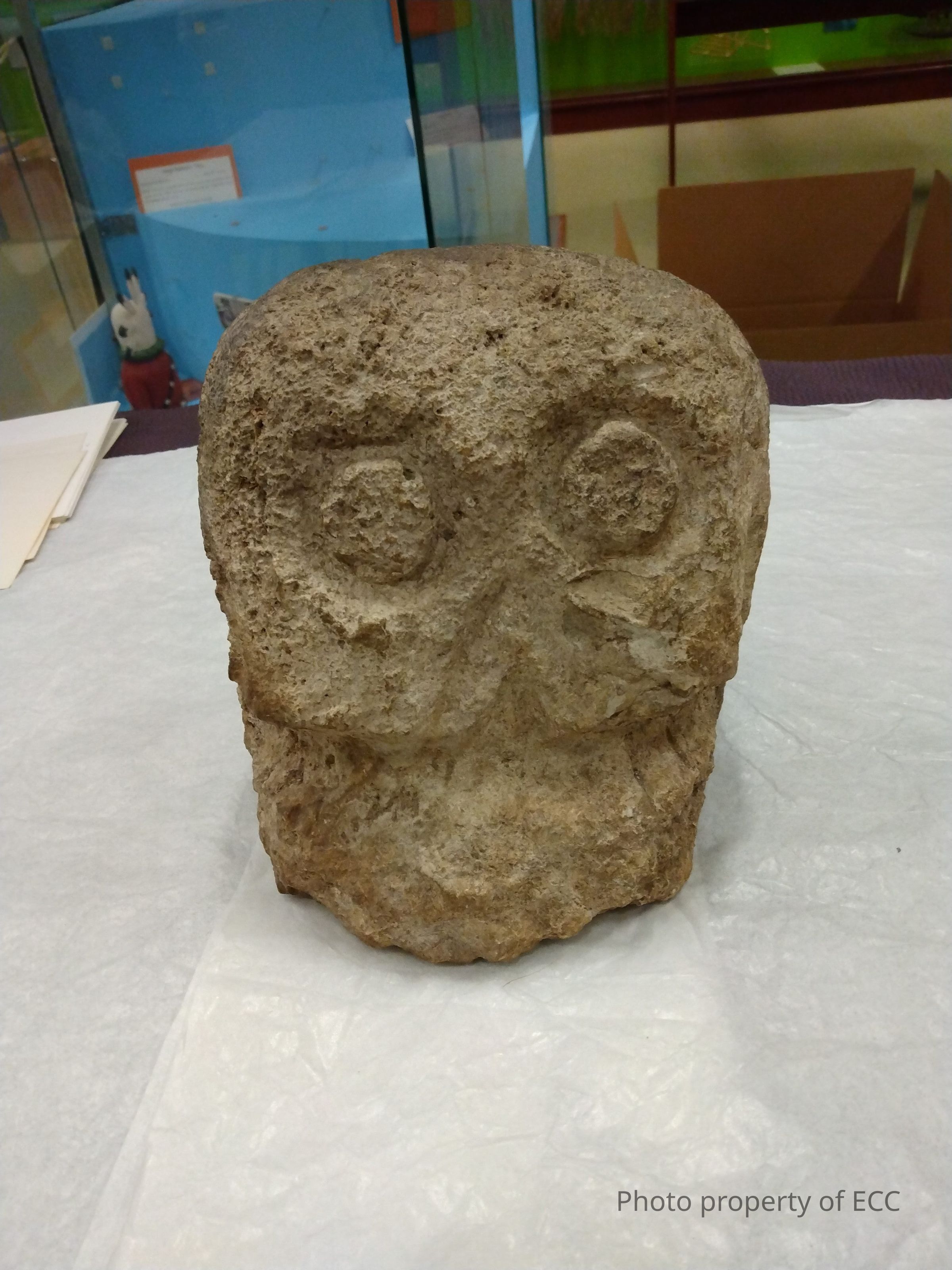Crude grinning skull pecked out of limestone with a tenor in the rear for affixing to a building.