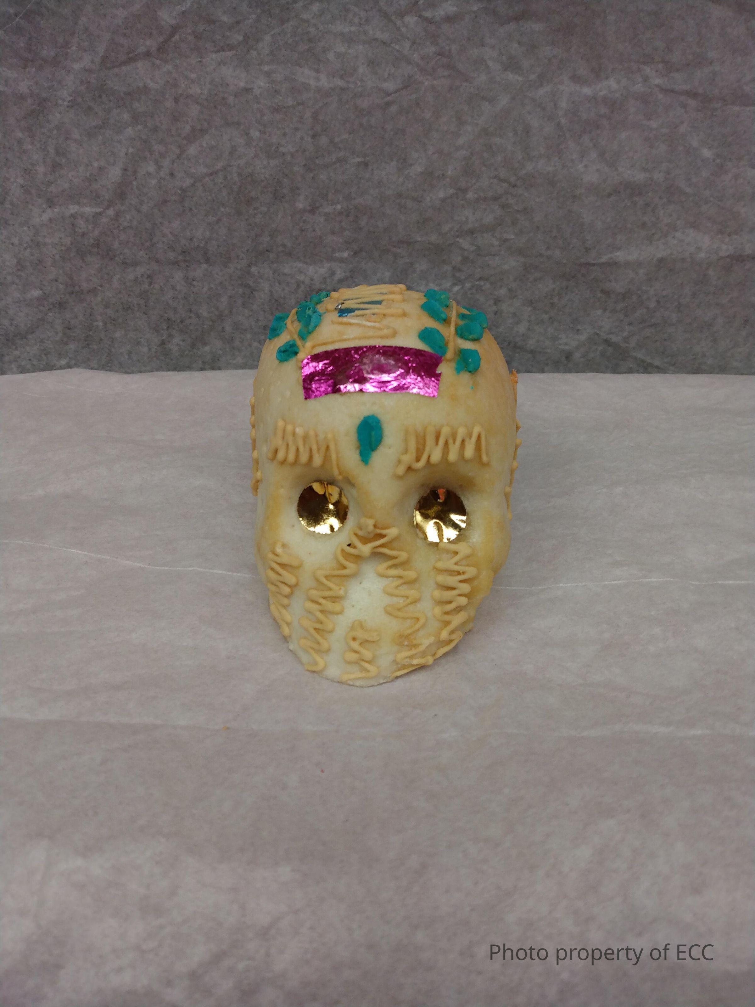 Medium size sugar skull with colorful designs of blue, and white. Pink foil on forehead and gold eyes.Collection