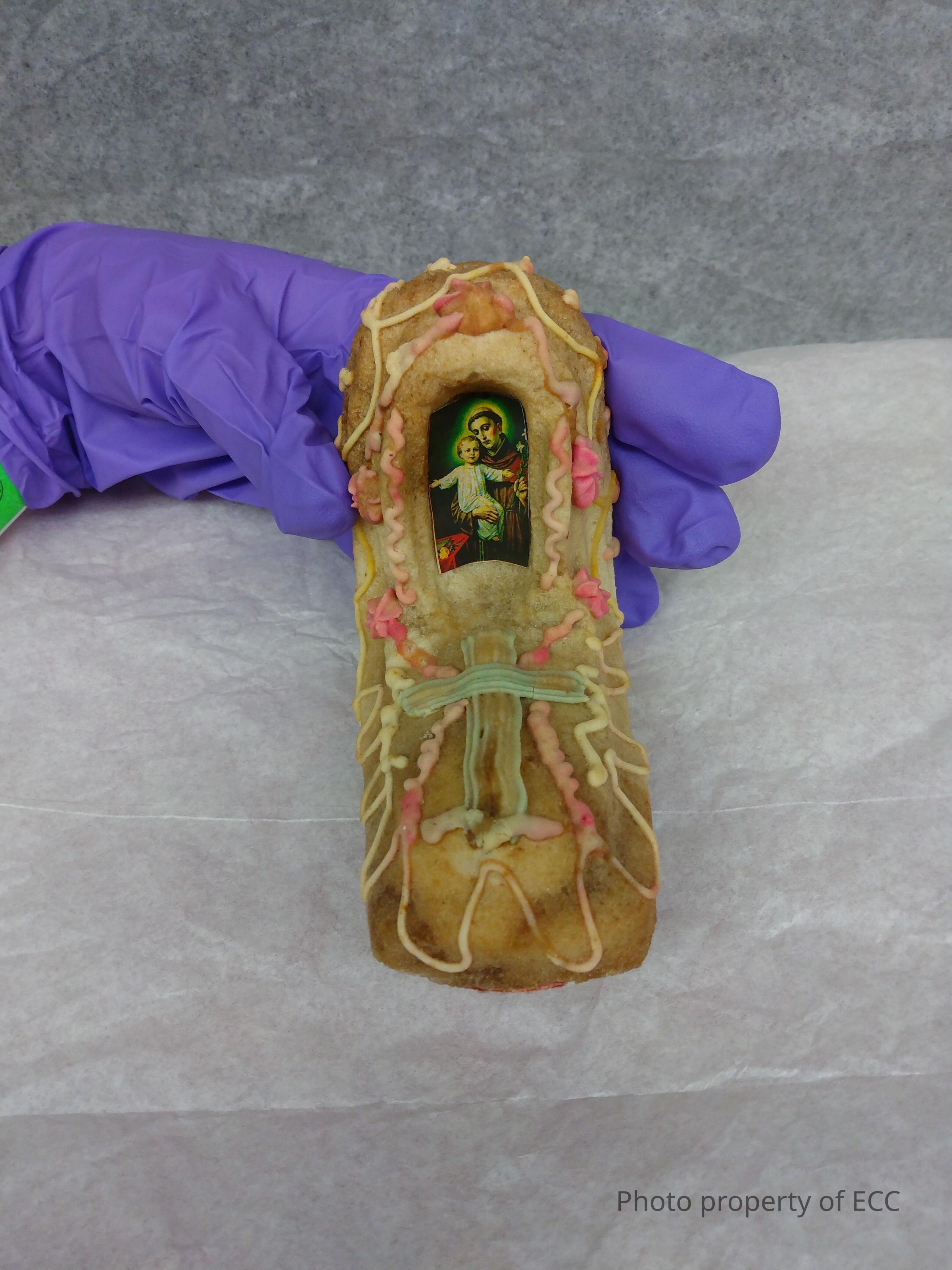 Small tomb with a picture of a saint and a baby Jesus. Pink and white icing décor on the tomb, as well as a blue cross.Collection