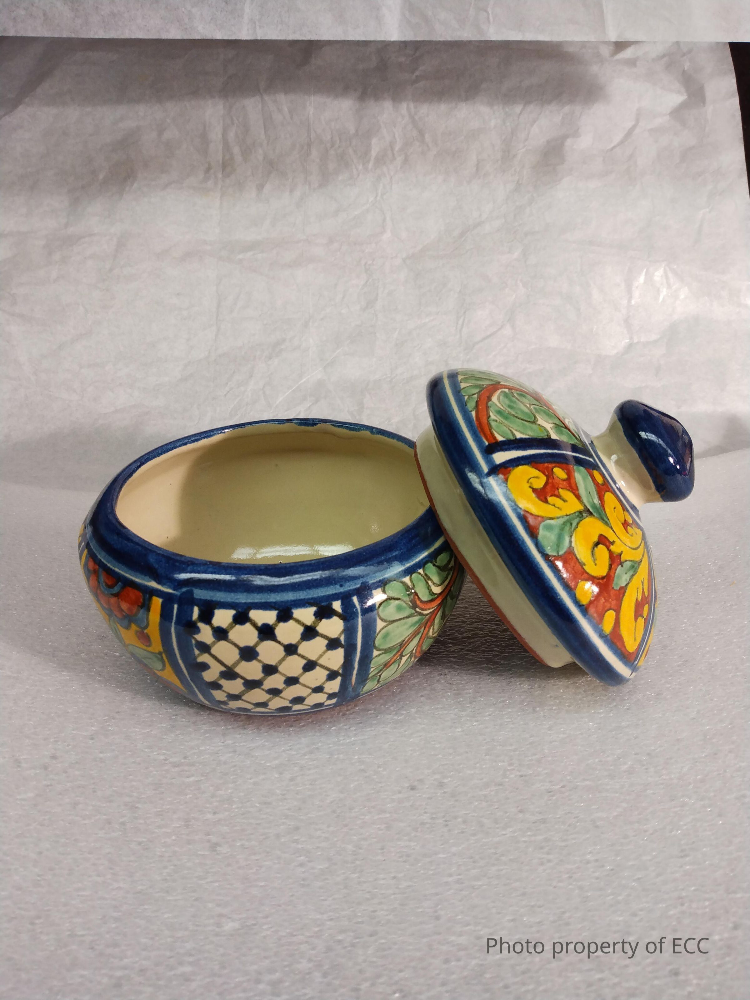 A small pot with a lid, in the talavera art style. Design consists of flowers and vines, with a criss-cross pattern in one section. Design is colorful, with blues, greens, and yellows.Use