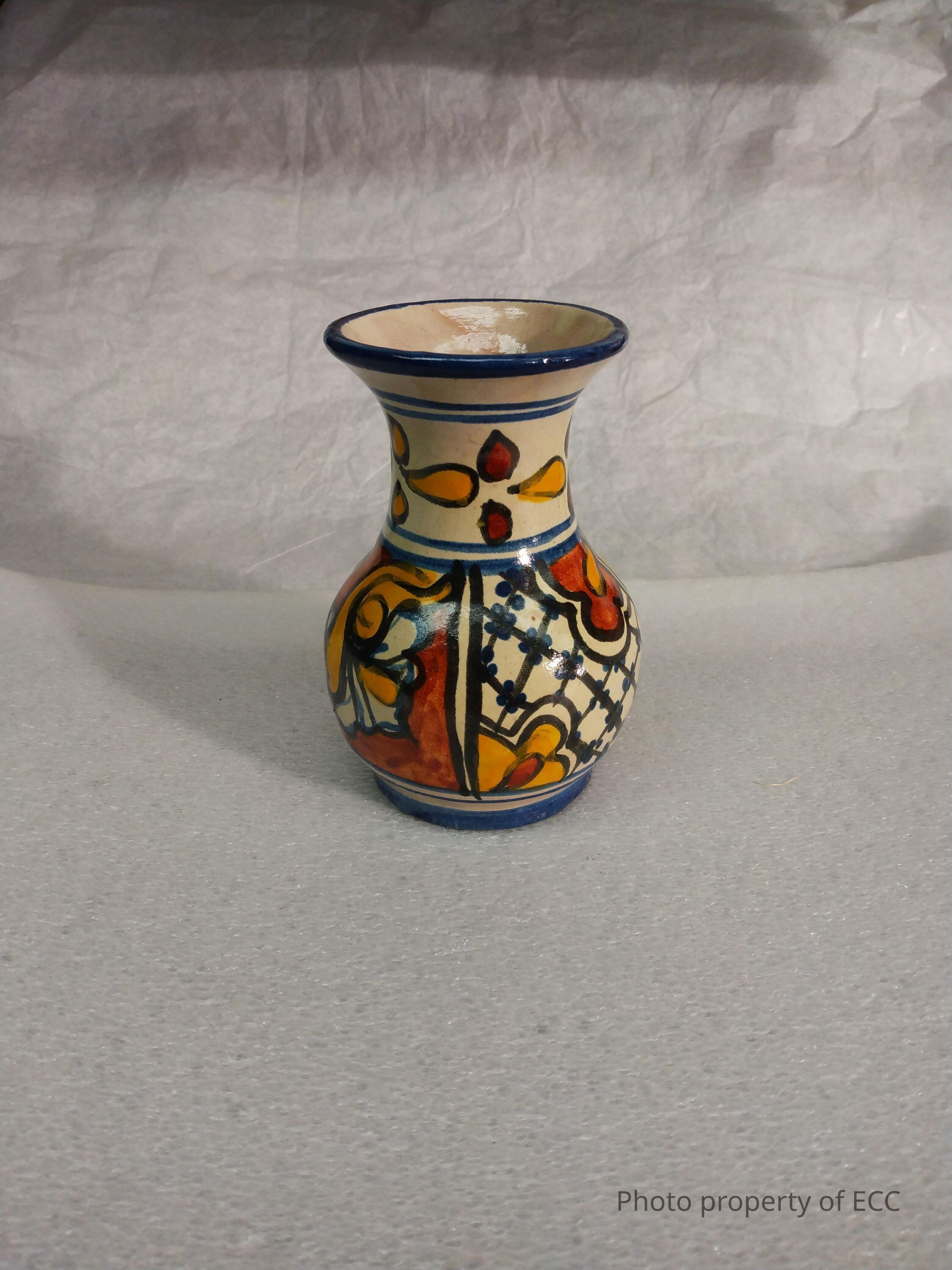 A small vase in the talavera style. It's decorated with a criss-cross and flower pattern, colored in blues, blacks, browns, and yellows.Context