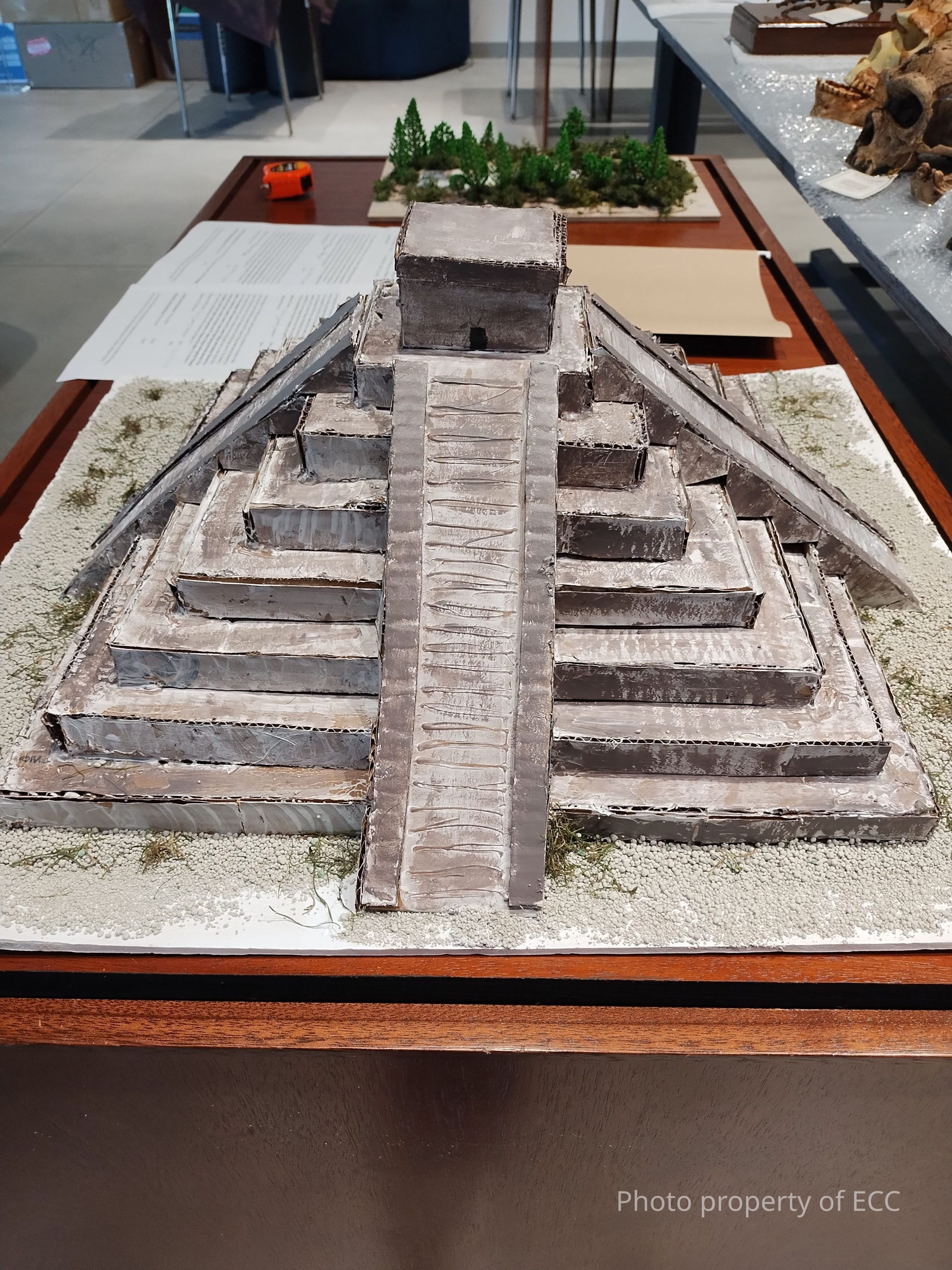 Model of the Temple of Kuklukan at Chichen Itza. The baseplate of the model is filled with dirt and model grass while the temple itself is constructed of cardboard and glue.Use