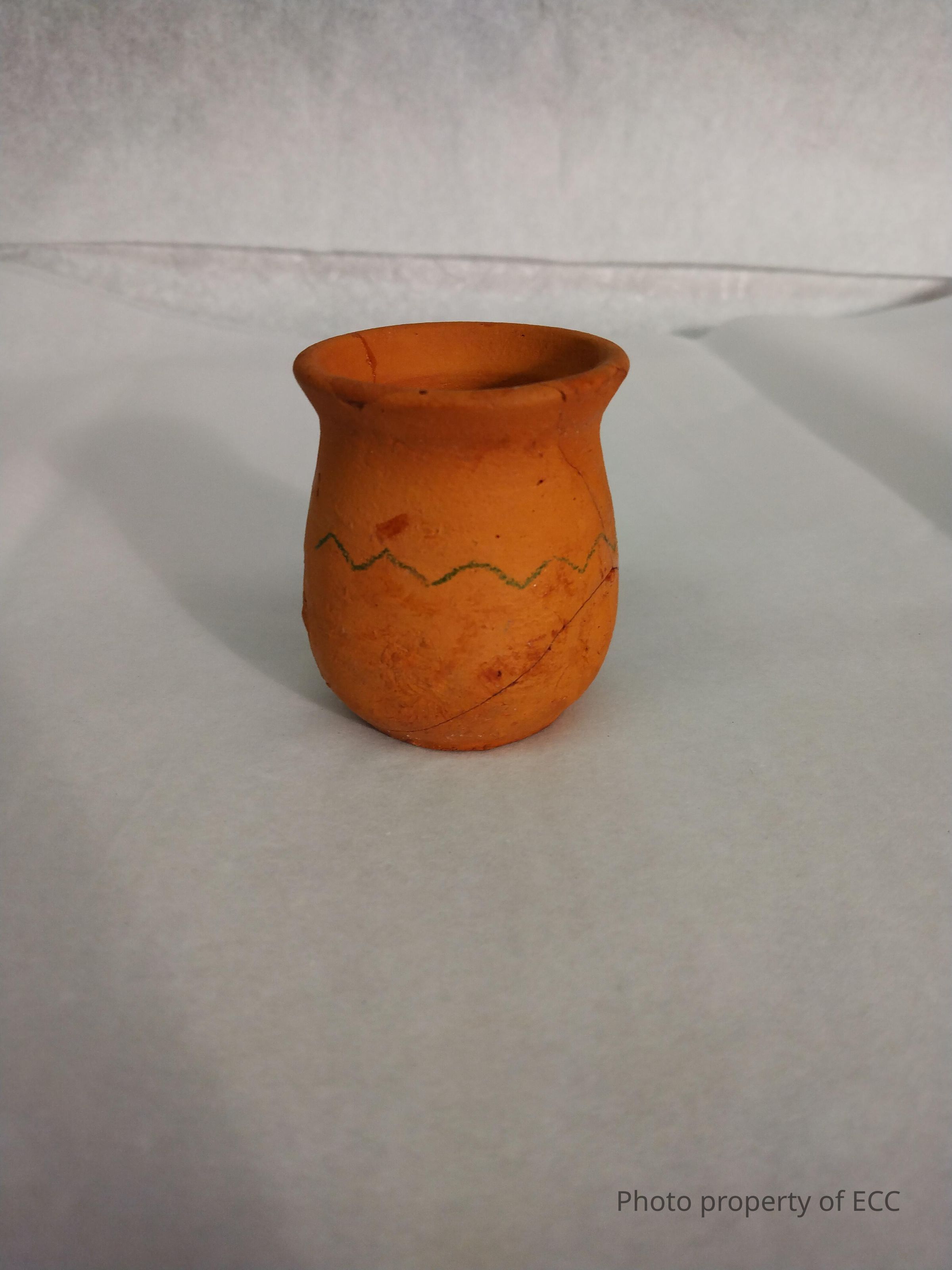 A small terracotta pot with a green zig-zag line pattern on one side. There are multiple cracks in the pot and one piece is missing.Collection
