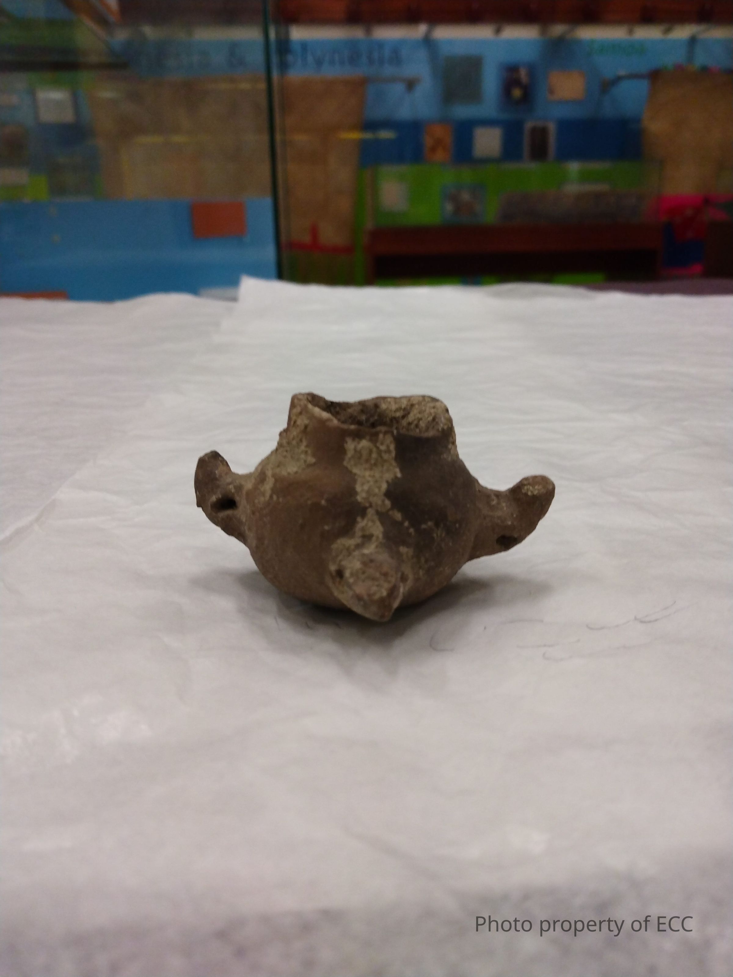 390 C: Smallest of the 5 ollas. Two lugs, one has a hole, the other does not. Clay used looks orange, has gray/black marks all over/inside body.Use