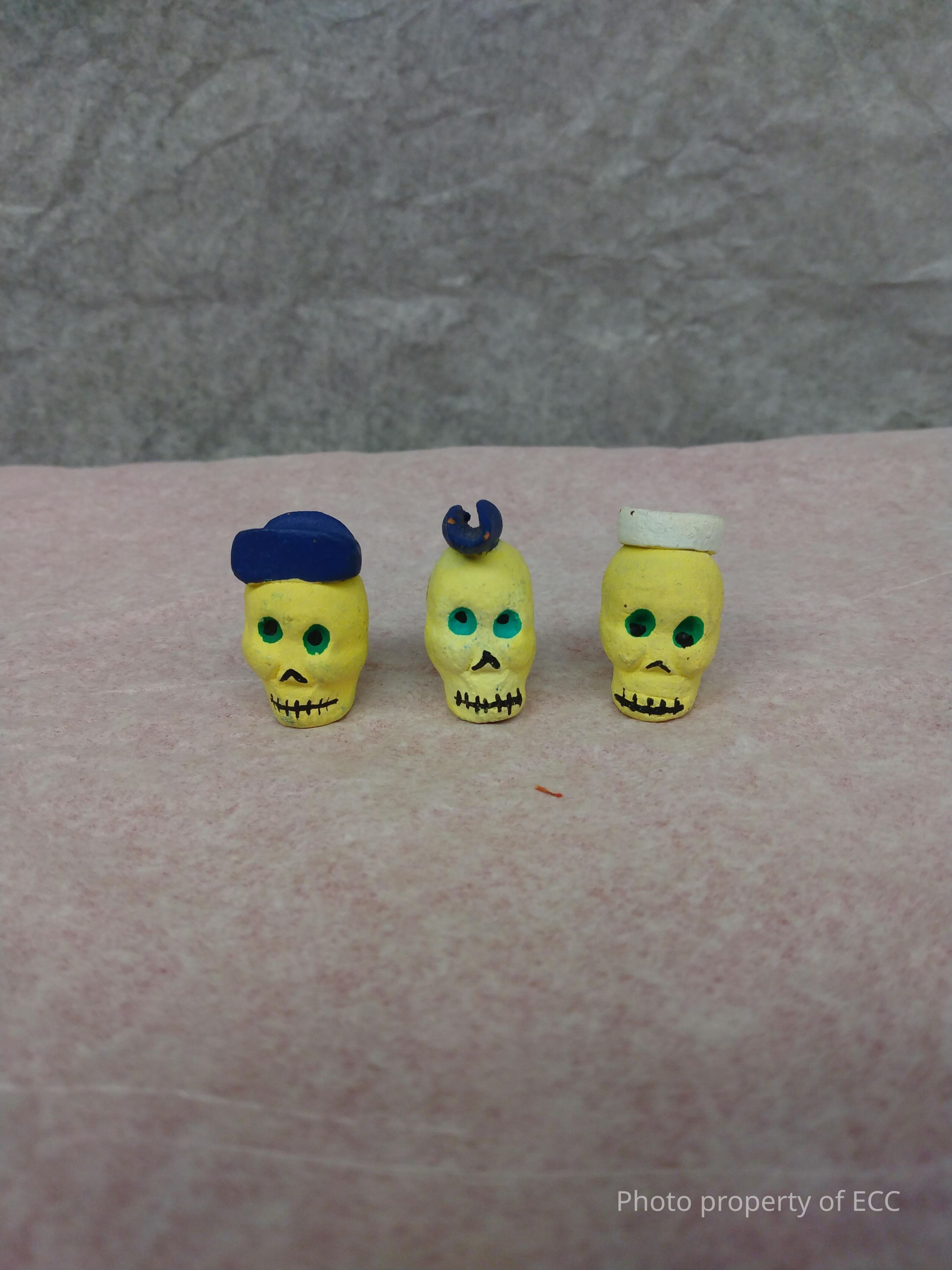 Three miniature skulls, painted yellow, with green and black eyes; Skull A (far left) wears a flat blue hat (possibly a beret), Skull B (middle) wears a curled blue hat, while Skull C (far right) wears a flat white hat.Collection