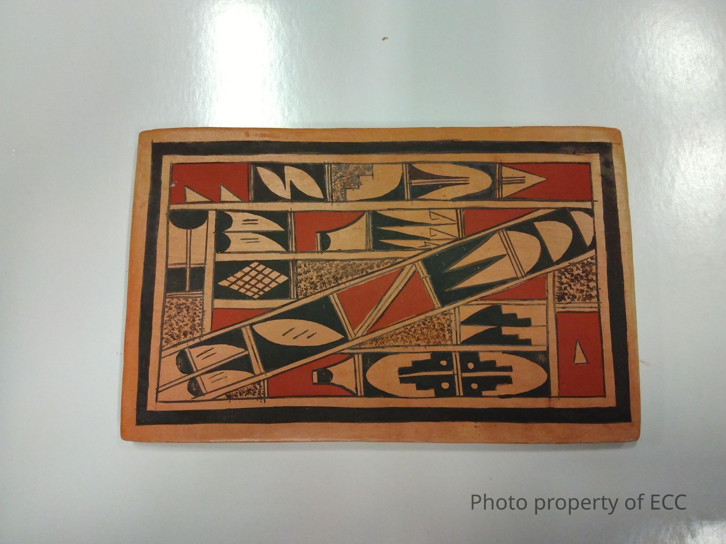 A tile painted with a geometric design of black and red on buff polychrome. It was handmade using native clay. The back corner of the tile is signed Kahe for the artist Valerie Kahe.Collection