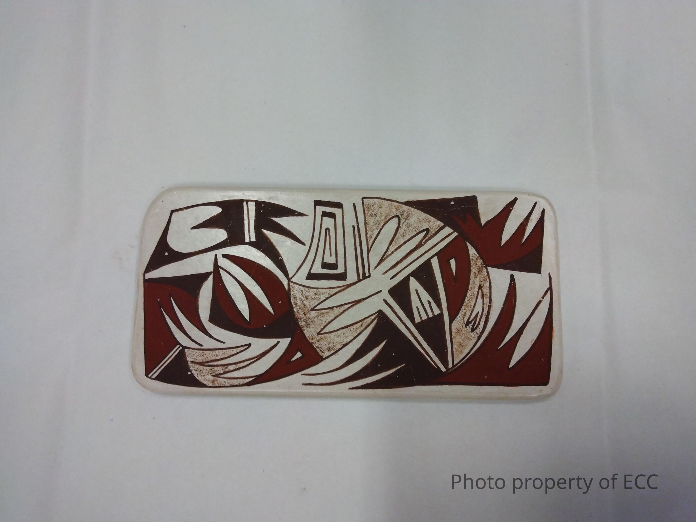 A tile painted with a stylized feather design in black and red on white polychrome. Handmade using native clay. The back is signed "M.N. & V.N.", for Maynard and Veronica Navasie, with a frog image.Collection