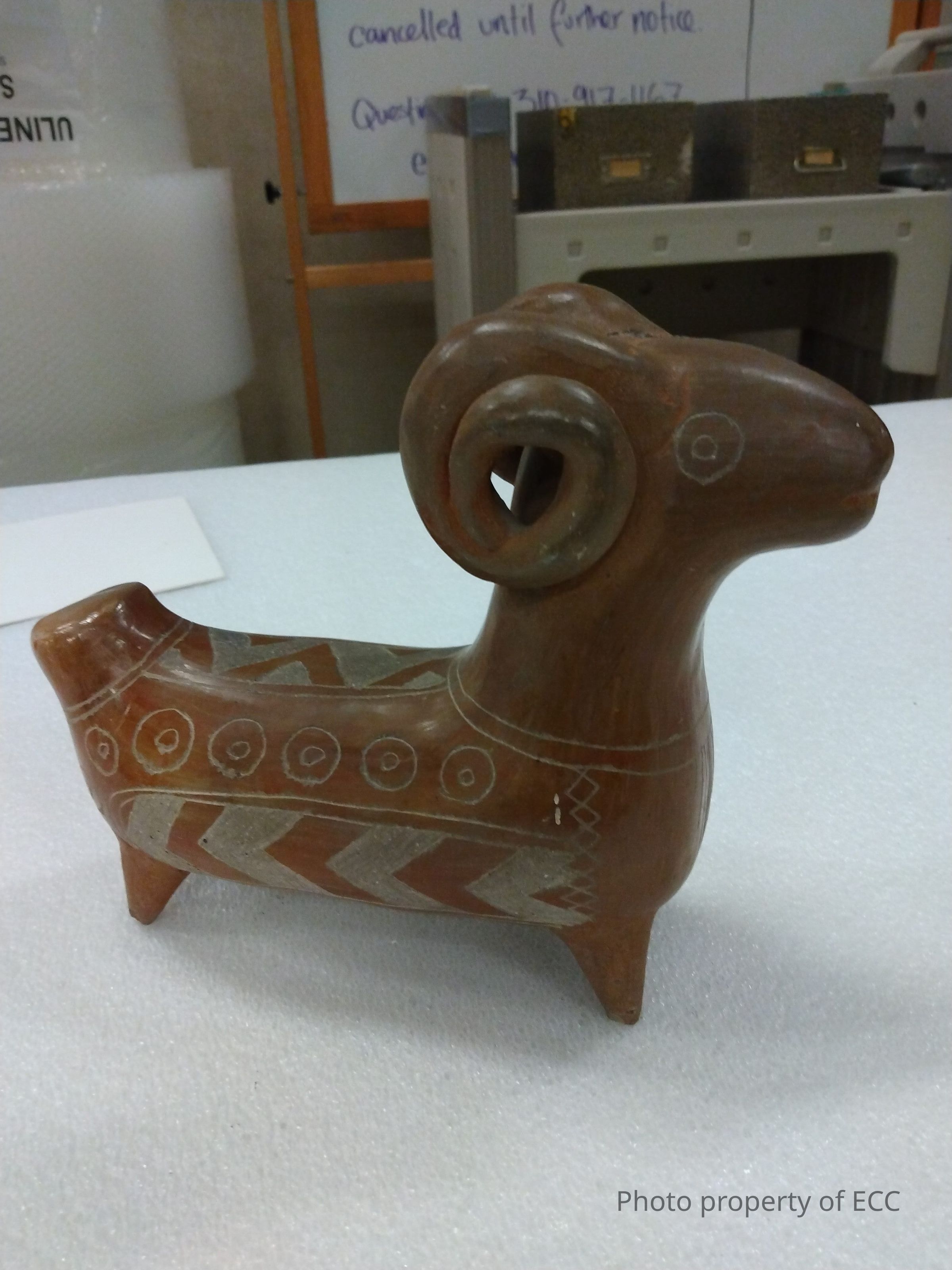A small, hollow ceramic ram with geometric designs consisting of circles, waves, lines, triangles and zigzags on body. Patterns are not identical on both sides. He has multiple cracks on his body: a narrow crack runs from a hole in the center of his belly, up his front, slightly off center, from his left leg, up over his head and down his back. Another narrow crack runs from the off-center crack on his face and through his left eye, while a large chip is visible on the top of his left horn. A piece of yellowed masking tape is attached to his stomach, with faded green ink. According to the original catalog card it once read "Modern Tanala Figure." Lastly, there are small drops of what could be white paint on his right side, near the zigzag pattern above his right leg.Collection