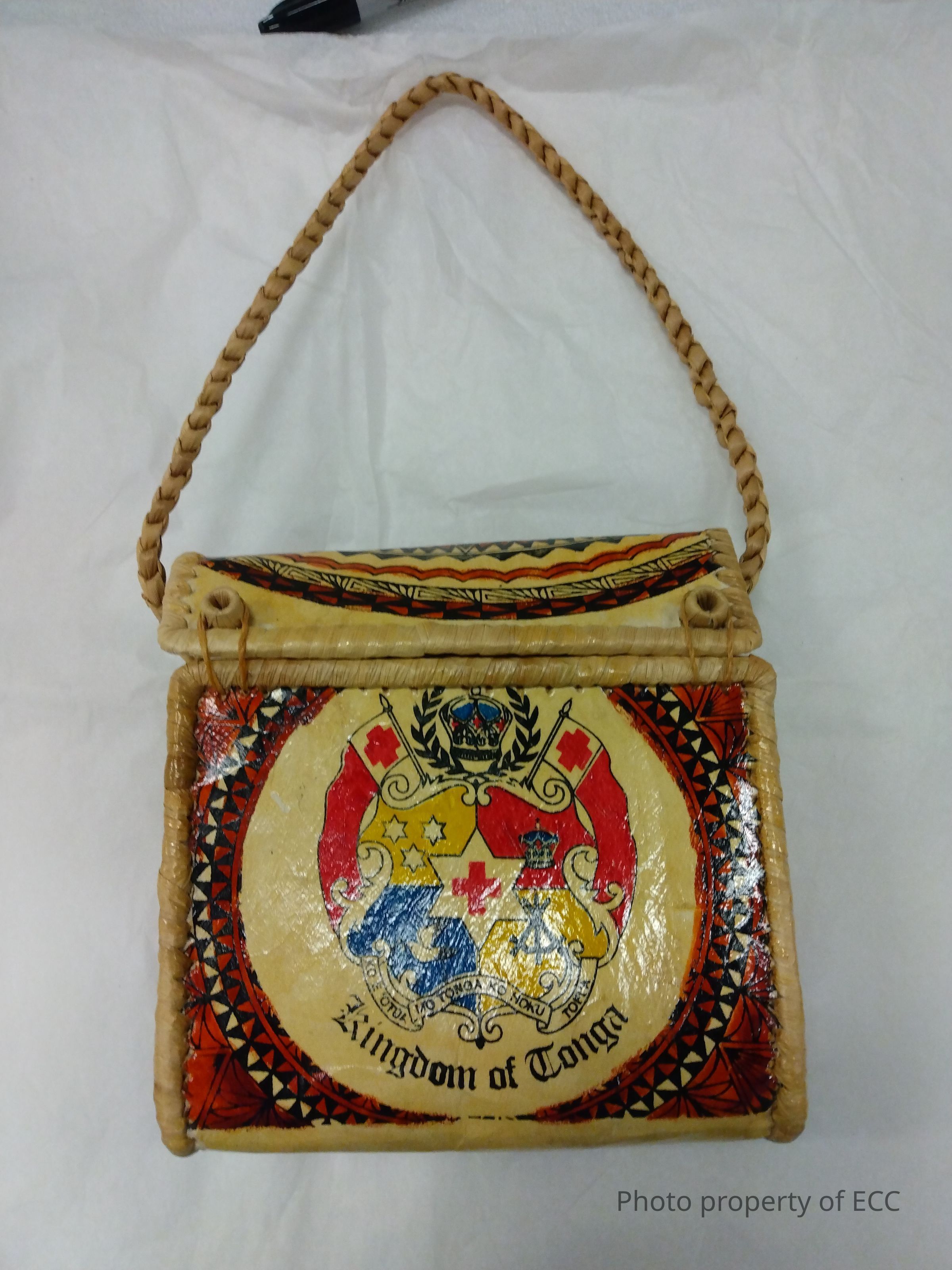 A handbag made from palm tree leaves. The front and back side of the bag has the Tongan coat of arms with "Kingdom of Tonga" written in Old English script beat the coat of arms. There are Tongan style patterns in a brownish orange color around the coat of arms that are also present on the side of the bags. The handle of the bag is a nicely tight braid piece of palm.Use